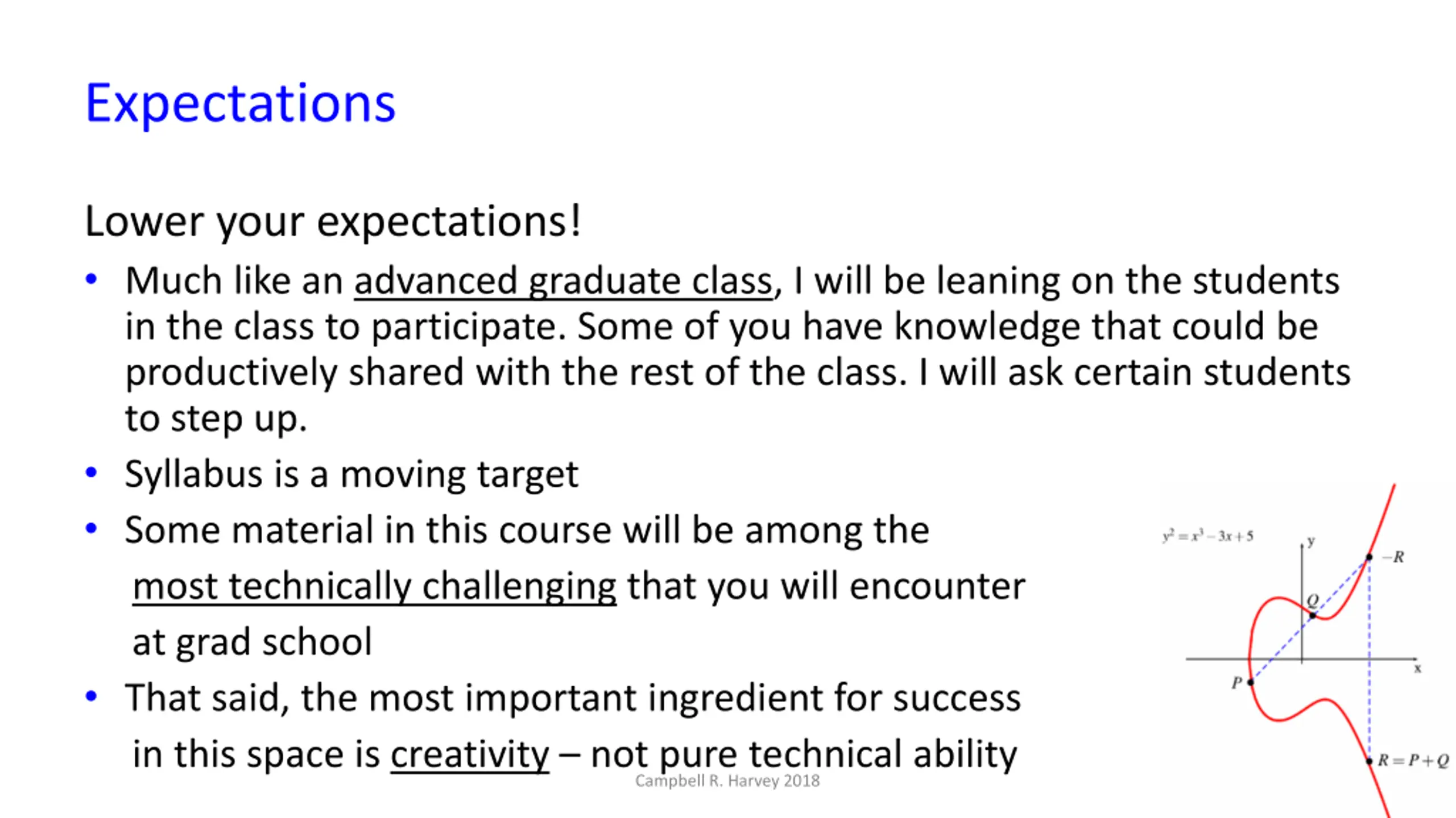 Expectations Lower your expectations! Much like an advanced graduate class, I will be leaning on the students in the class to participate. Some of you have knowledge that could be productively shared with the rest of the class. I will ask certain students to step up. Syllabus is a moving target Some material in this course will be among the most technically challenging that you will encounter at grad school That said, the most important ingredient for success in this space is creativity not pure technical ability Campbell R. Harvey 2018