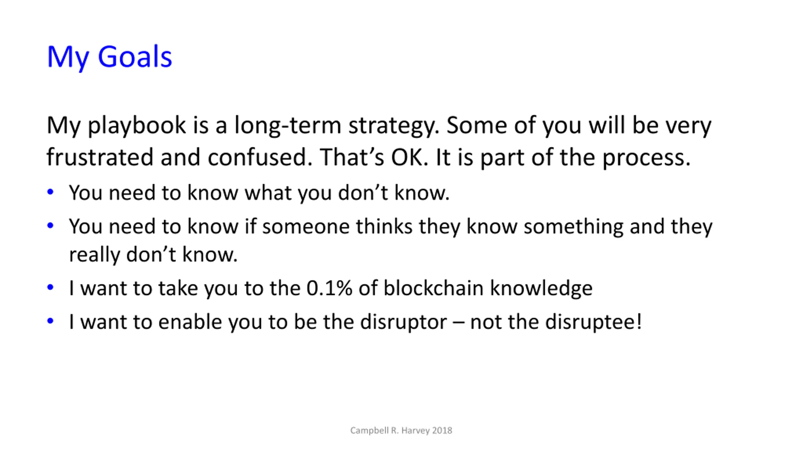 My Goals My playbook is a long-term strategy. Some of you will be very frustrated and confused. That s OK. It is part of the process. You need to know what you don t know. You need to know if someone thinks they know something and they really don t know. I want to take you to the 0.1% of blockchain knowledge I want to enable you to be the disruptor not the disruptee! Campbell R. Harvey 2018