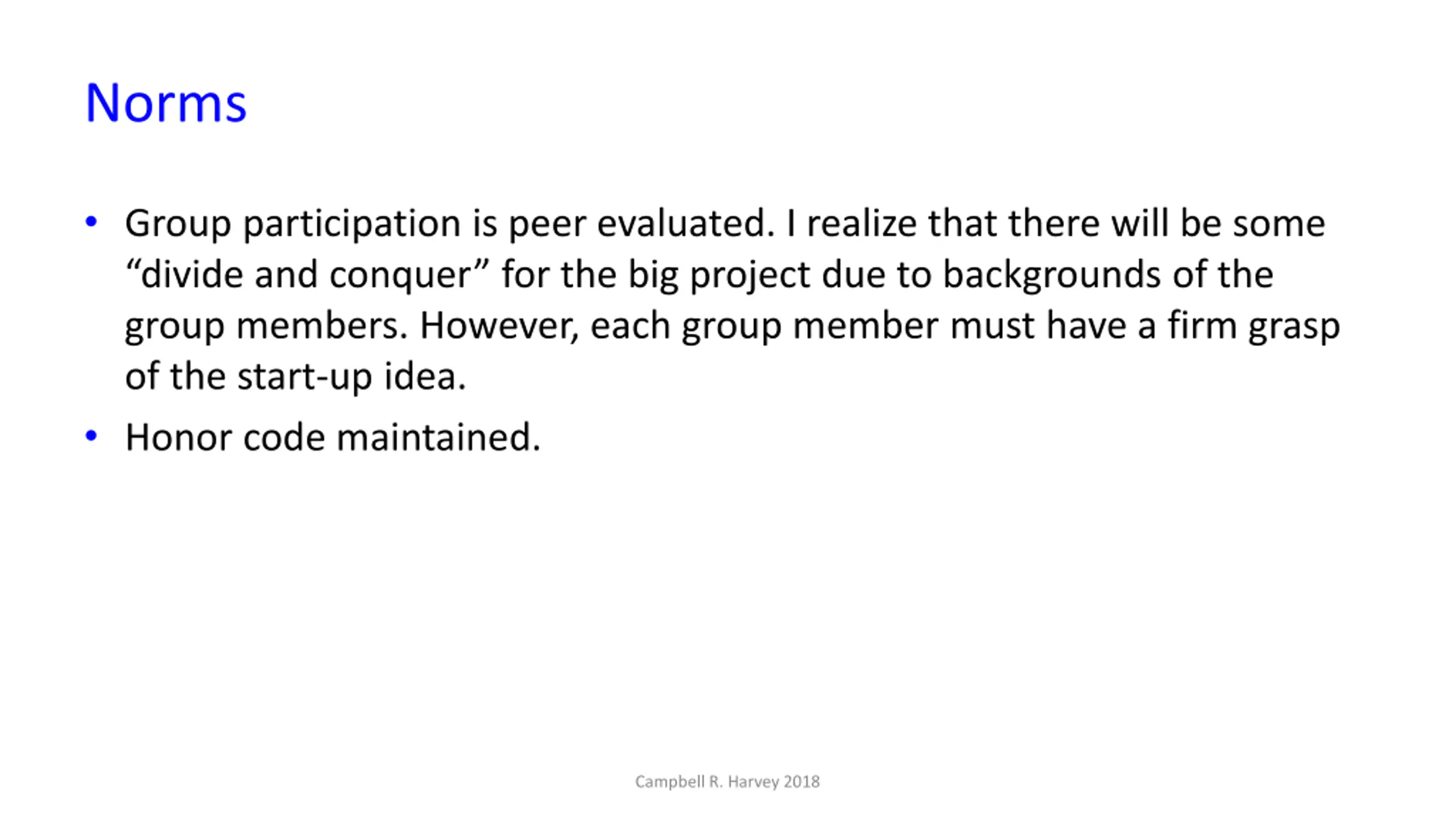 Norms Group participation is peer evaluated. I realize that there will be some divide and conquer for the big project due to backgrounds of the group members. However, each group member must have a firm grasp of the start-up idea. Honor code maintained. Campbell R. Harvey 2018