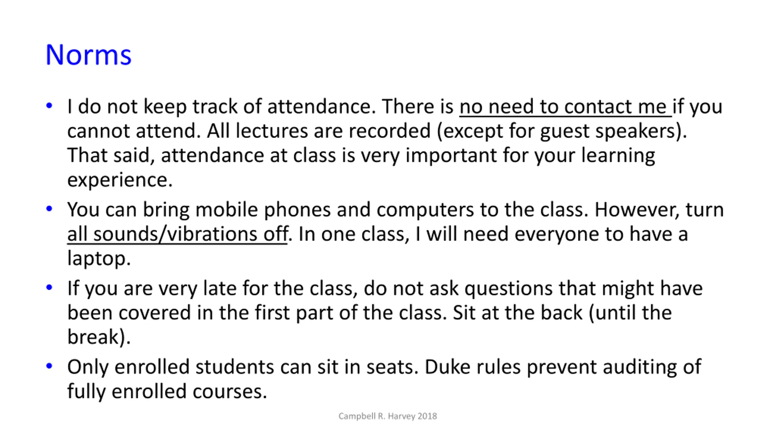 Norms I do not keep track of attendance. There is no need to contact me if you cannot attend. All lectures are recorded (except for guest speakers). That said, attendance at class is very important for your learning experience. You can bring mobile phones and computers to the class. However, turn all sounds/vibrations off. In one class, I will need everyone to have a laptop. If you are very late for the class, do not ask questions that might have been covered in the first part of the class. Sit at the back (until the break). Only enrolled students can sit in seats. Duke rules prevent auditing of fully enrolled courses. Campbell R. Harvey 2018