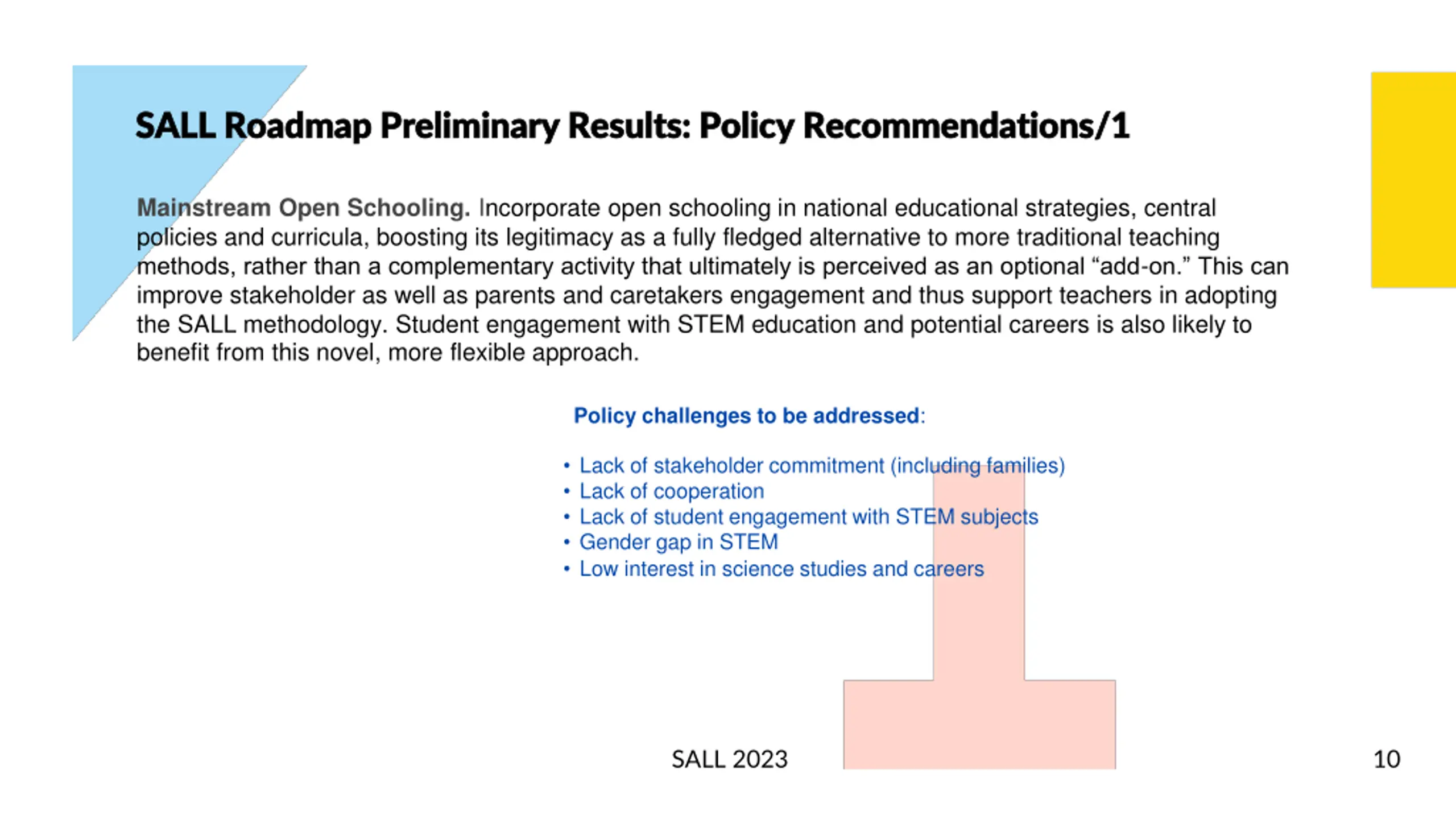 SALL Roadmap Preliminary Results: Policy Recommendations/1 SALL Roadmap Preliminary Results: Policy Recommendations/1 Mainstream Open Schooling. Incorporate open schooling in national educational strategies, central policies and curricula, boosting its legitimacy as a fully fledged alternative to more traditional teaching methods, rather than a complementary activity that ultimately is perceived as an optional add-on. This can improve stakeholder as well as parents and caretakers engagement and thus support teachers in adopting the SALL methodology. Student engagement with STEM education and potential careers is also likely to benefit from this novel, more flexible approach. Policy challenges to be addressed: Lack of stakeholder commitment (including families) Lack of cooperation Lack of student engagement with STEM subjects Gender gap in STEM Low interest in science studies and careers 10 SALL 2023
