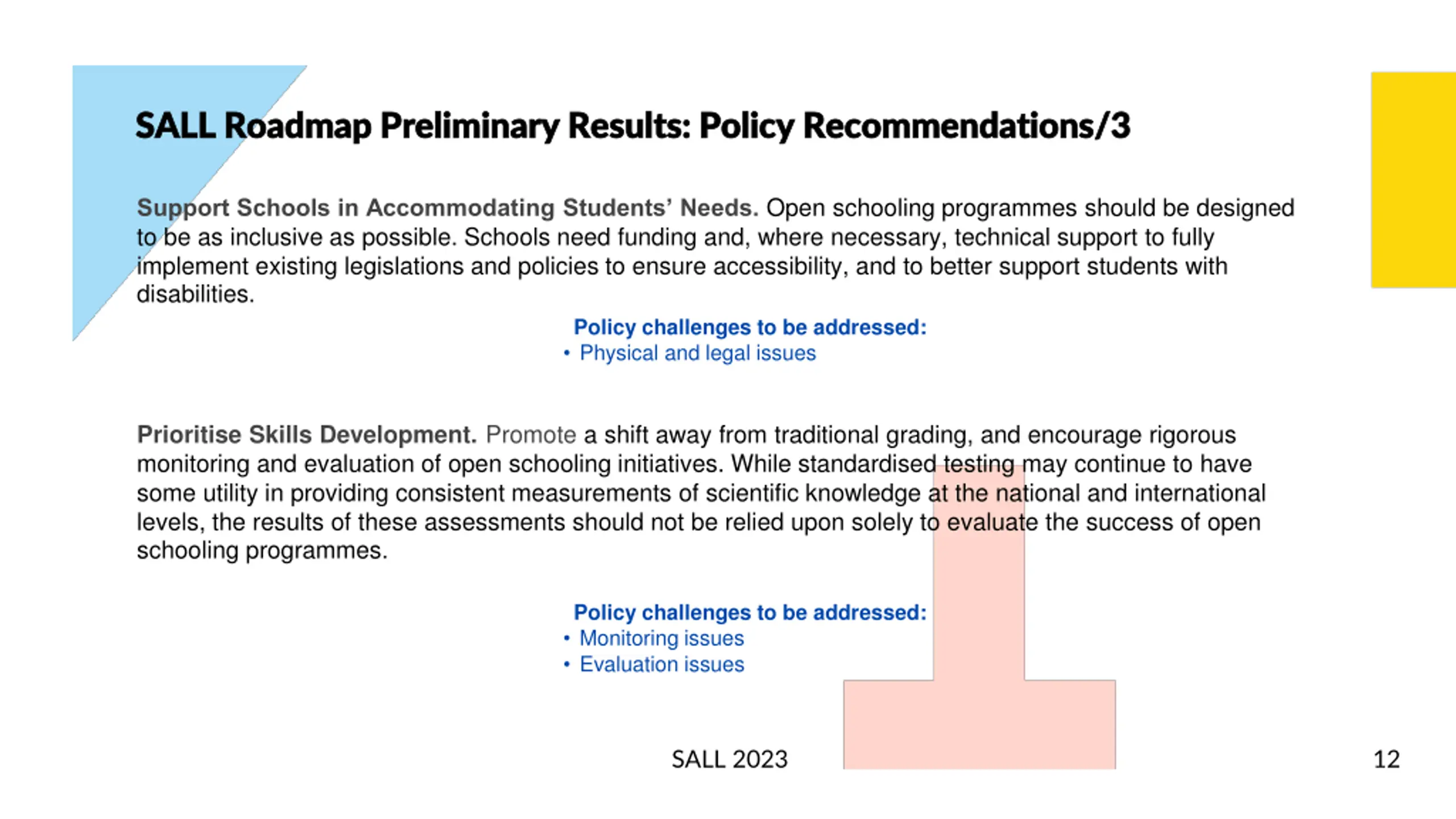 SALL Roadmap Preliminary Results: Policy Recommendations/3 SALL Roadmap Preliminary Results: Policy Recommendations/3 Support Schools in Accommodating Students Needs. Open schooling programmes should be designed to be as inclusive as possible. Schools need funding and, where necessary, technical support to fully implement existing legislations and policies to ensure accessibility, and to better support students with disabilities. Policy challenges to be addressed: Physical and legal issues Prioritise Skills Development. Promote a shift away from traditional grading, and encourage rigorous monitoring and evaluation of open schooling initiatives. While standardised testing may continue to have some utility in providing consistent measurements of scientific knowledge at the national and international levels, the results of these assessments should not be relied upon solely to evaluate the success of open schooling programmes. Policy challenges to be addressed: Monitoring issues Evaluation issues 12 SALL 2023