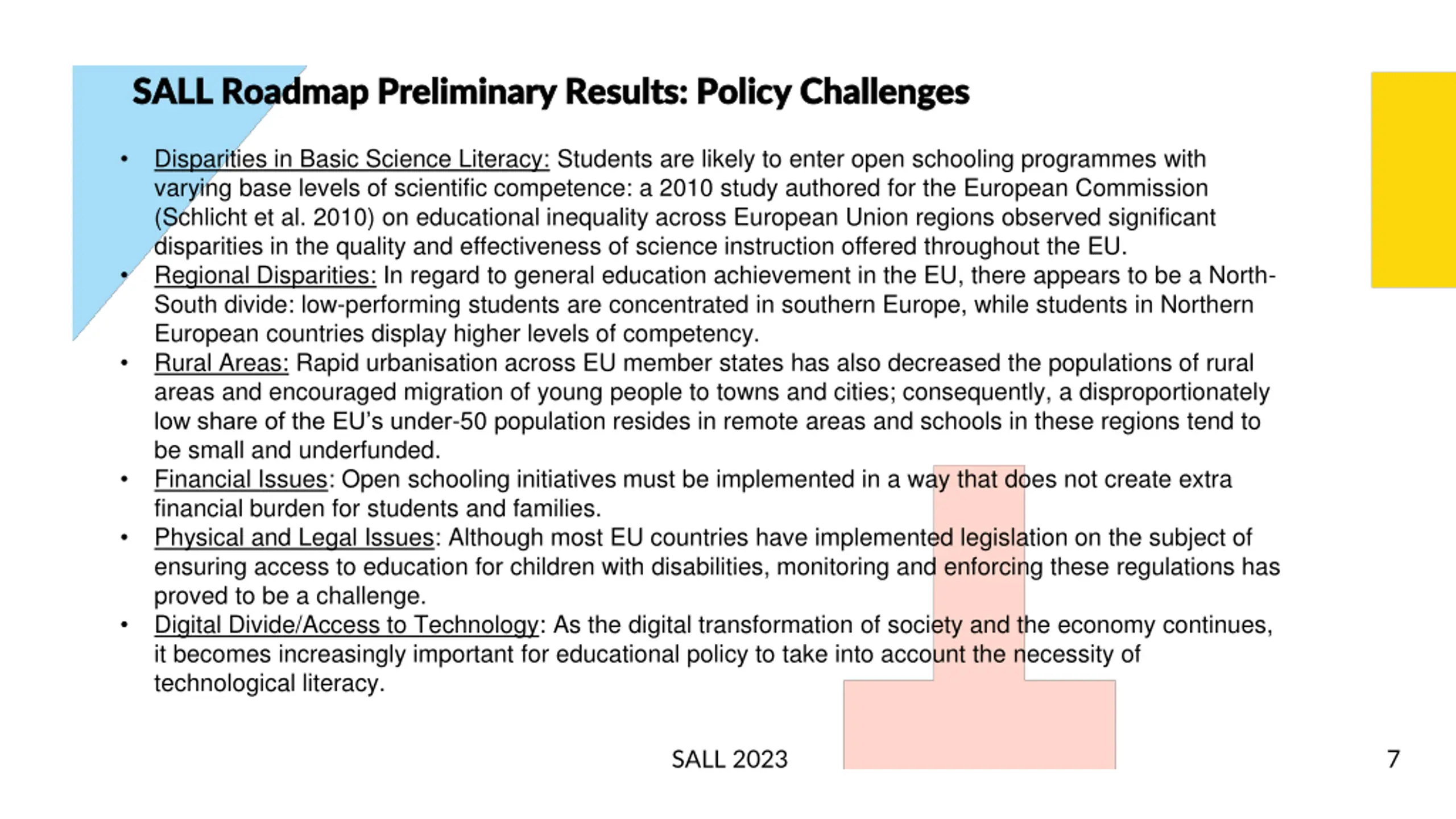 SALL Roadmap Preliminary Results: Policy Challenges SALL Roadmap Preliminary Results: Policy Challenges Disparities in Basic Science Literacy: Students are likely to enter open schooling programmes with varying base levels of scientific competence: a 2010 study authored for the European Commission (Schlicht et al. 2010) on educational inequality across European Union regions observed significant disparities in the quality and effectiveness of science instruction offered throughout the EU. Regional Disparities: In regard to general education achievement in the EU, there appears to be a North- South divide: low-performing students are concentrated in southern Europe, while students in Northern European countries display higher levels of competency. Rural Areas: Rapid urbanisation across EU member states has also decreased the populations of rural areas and encouraged migration of young people to towns and cities; consequently, a disproportionately low share of the EU s under-50 population resides in remote areas and schools in these regions tend to be small and underfunded. Financial Issues: Open schooling initiatives must be implemented in a way that does not create extra financial burden for students and families. Physical and Legal Issues: Although most EU countries have implemented legislation on the subject of ensuring access to education for children with disabilities, monitoring and enforcing these regulations has proved to be a challenge. Digital Divide/Access to Technology: As the digital transformation of society and the economy continues, it becomes increasingly important for educational policy to take into account the necessity of technological literacy. 7 SALL 2023