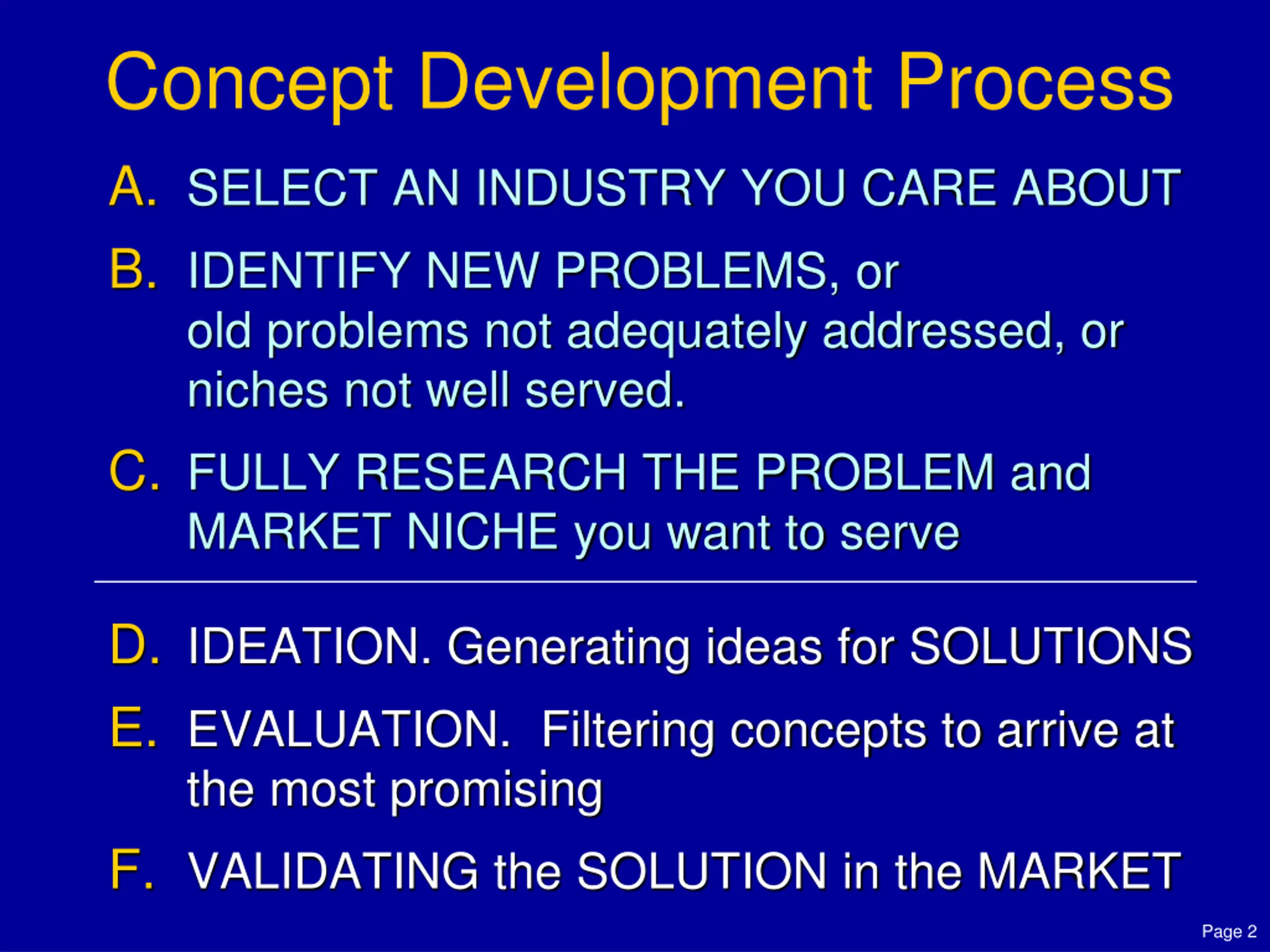 Concept Development Process A. SELECT AN INDUSTRY YOU CARE ABOUT B. IDENTIFY NEW PROBLEMS, or old problems not adequately addressed, or niches not well served. C. FULLY RESEARCH THE PROBLEM and MARKET NICHE you want to serve D. IDEATION. Generating ideas for SOLUTIONS E. EVALUATION. Filtering concepts to arrive at the most promising F. VALIDATING the SOLUTION in the MARKET Page 2