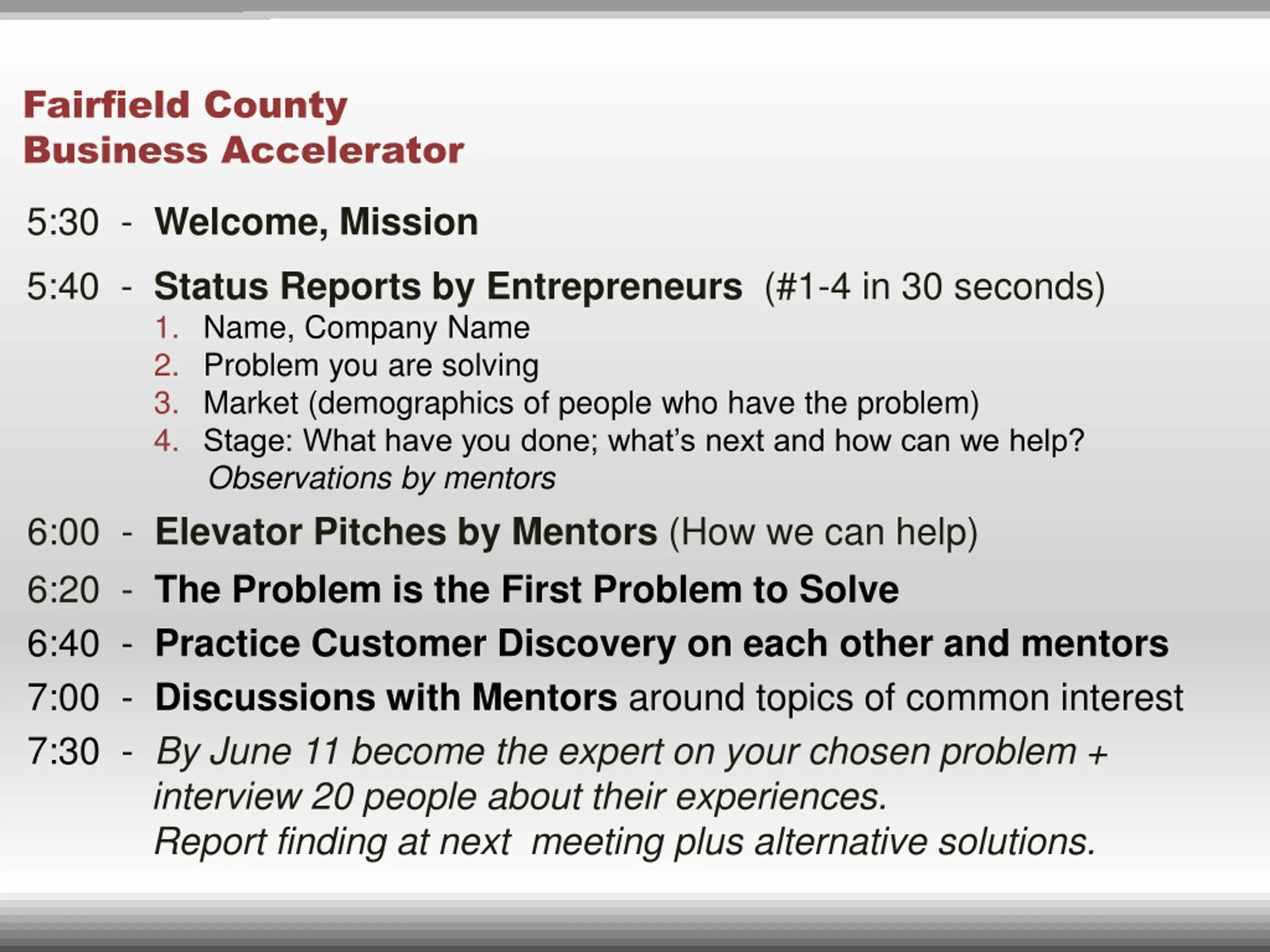 Fairfield County Business Accelerator 5:30 - Welcome, Mission 5:40- Status Reports by Entrepreneurs (#1-4 in 30 seconds) 1. Name, Company Name 2. Problem you are solving 3. Market (demographics of people who have the problem) 4. Stage: What have you done; what s next and how can we help? Observations by mentors 6:00 - Elevator Pitches by Mentors (How we can help) 6:20 - The Problem is the First Problem to Solve 6:40 - Practice Customer Discovery: Have you had this problem? 7:00 - Discussions with Mentors around topics of common interest 7:30 - By June 11 become the expert on your chosen problem + interview 20 people about their experiences. Report finding at next meeting plus alternative solutions.