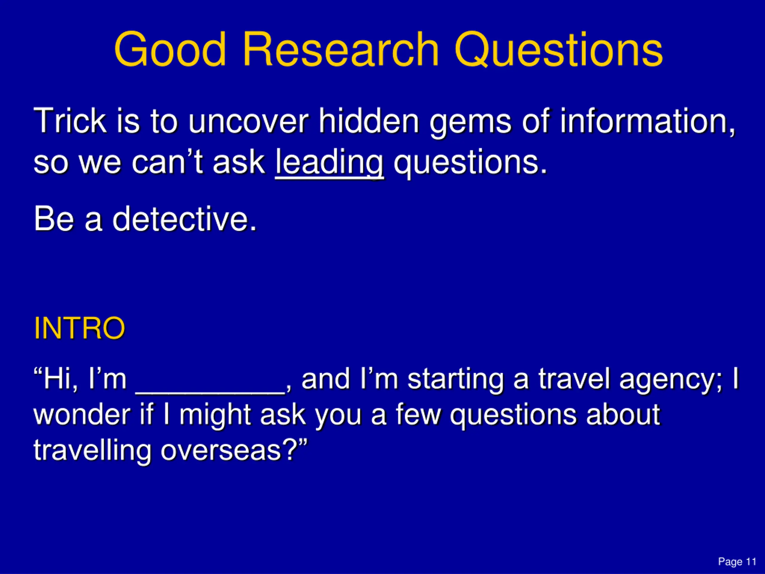 Good Research Questions Trick is to uncover hidden gems of information, so we can t ask leading questions. Be a detective. INTRO Hi, I m _________, and I m starting a travel agency; I wonder if I might ask you a few questions about travelling overseas? Page 11