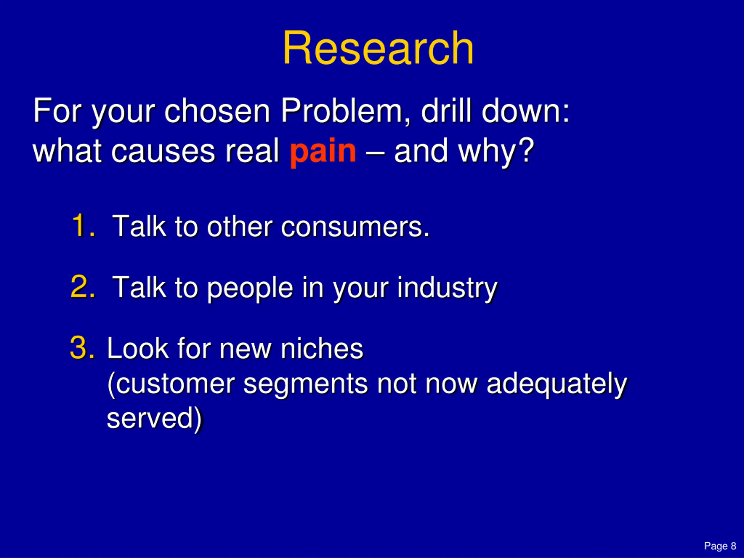 Research For your chosen Problem, drill down: what causes real pain and why? 1. Talk to other consumers. 2. Talk to people in your industry 3. Look for new niches (customer segments not now adequately served) Page 8