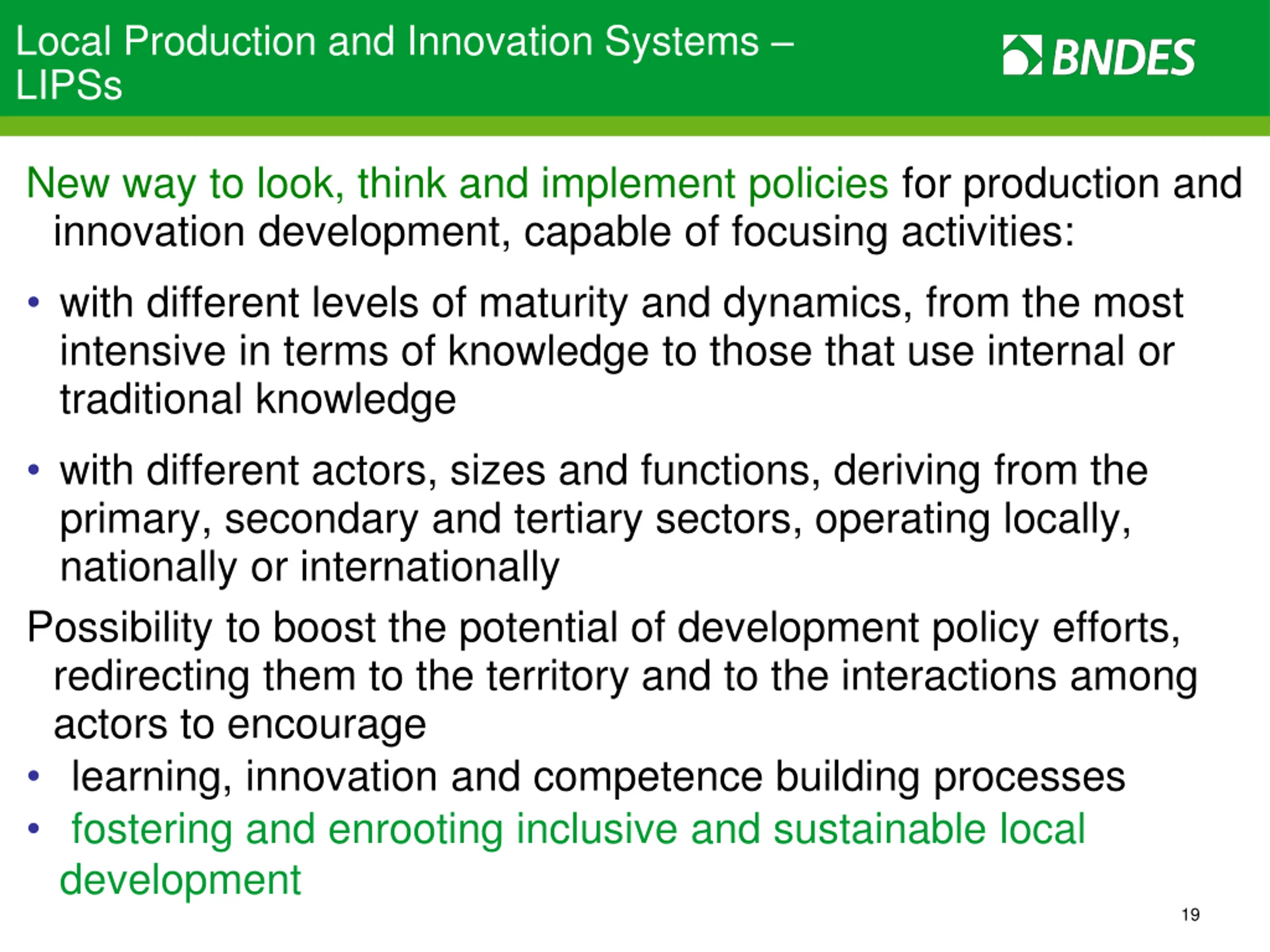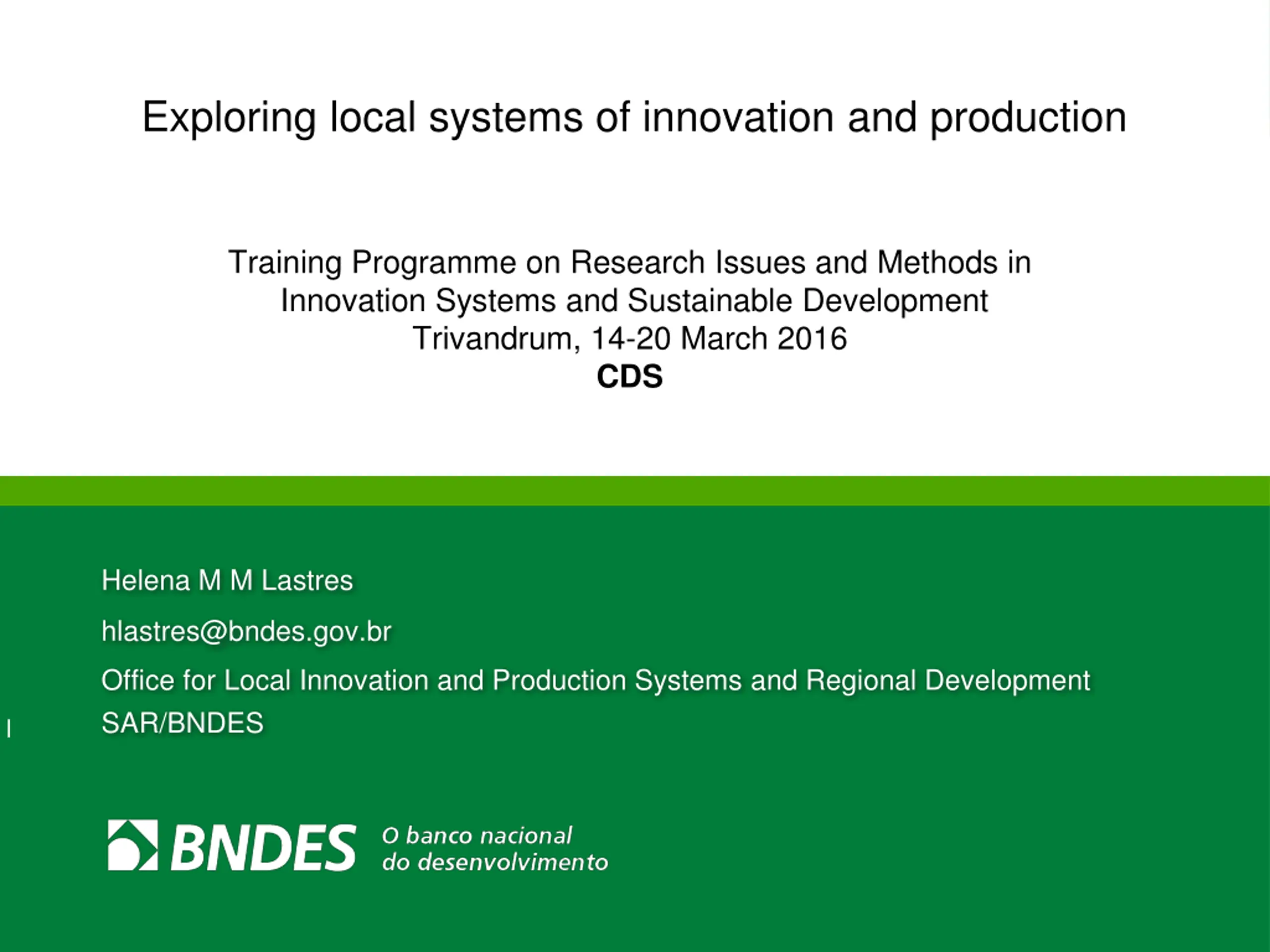 Exploring local systems of innovation and production Training Programme on Research Issues and Methods in Innovation Systems and Sustainable Development Trivandrum, 14-20 March 2016 CDS Helena M M Lastres hlastres@bndes.gov.br Office for Local Innovation and Production Systems and Regional Development SAR/BNDES l