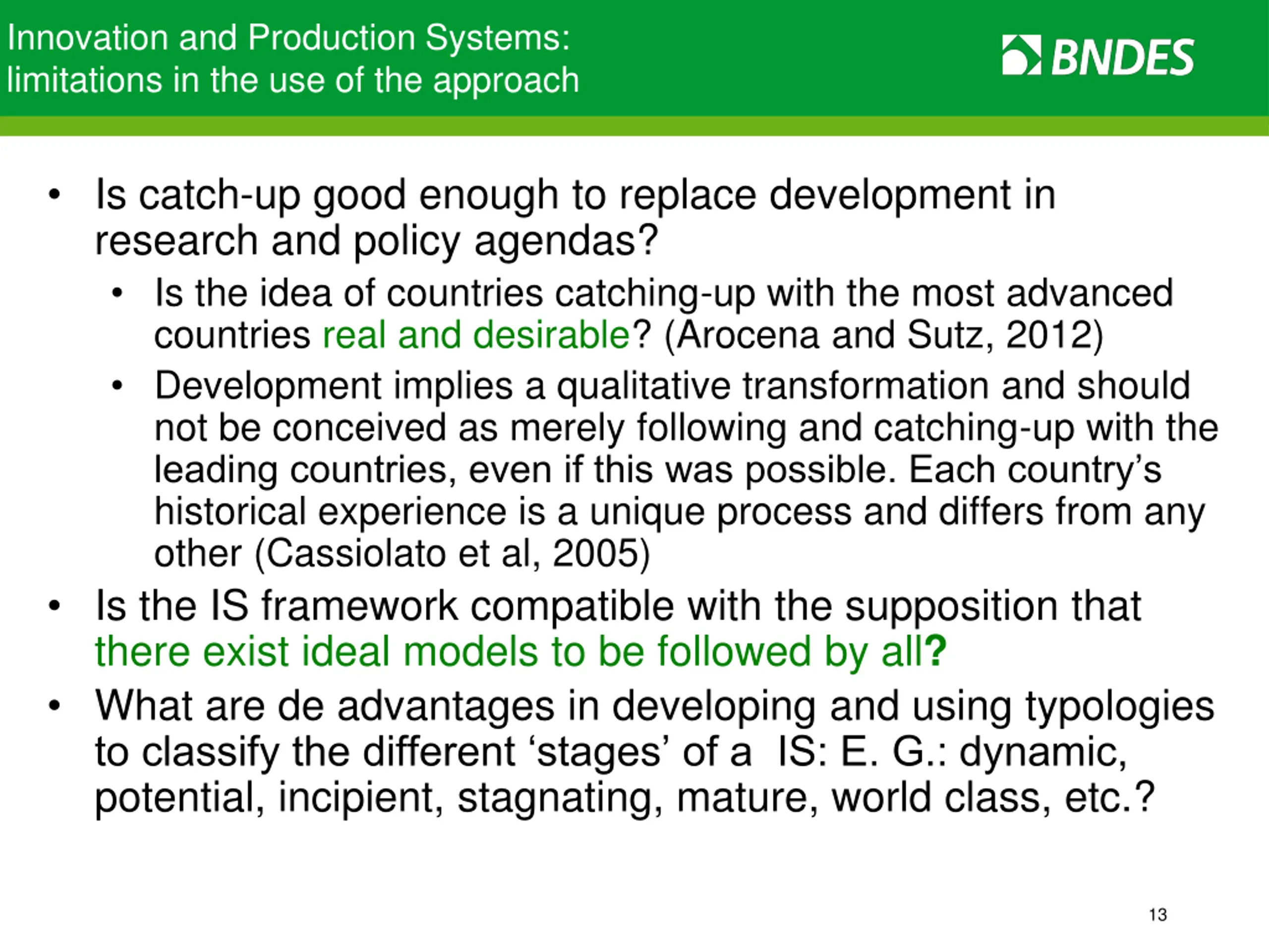 Innovation and Production Systems: limitations in the use of the approach Is catch-up good enough to replace development in research and policy agendas? Is the idea of countries catching-up with the most advanced countries real and desirable? (Arocena and Sutz, 2012) Development implies a qualitative transformation and should not be conceived as merely following and catching-up with the leading countries, even if this was possible. Each country s historical experience is a unique process and differs from any other (Cassiolato et al, 2005) Is the IS framework compatible with the supposition that there exist ideal models to be followed by all? What are de advantages in developing and using typologies to classify the different stages of a IS: E. G.: dynamic, potential, incipient, stagnating, mature, world class, etc.? 13