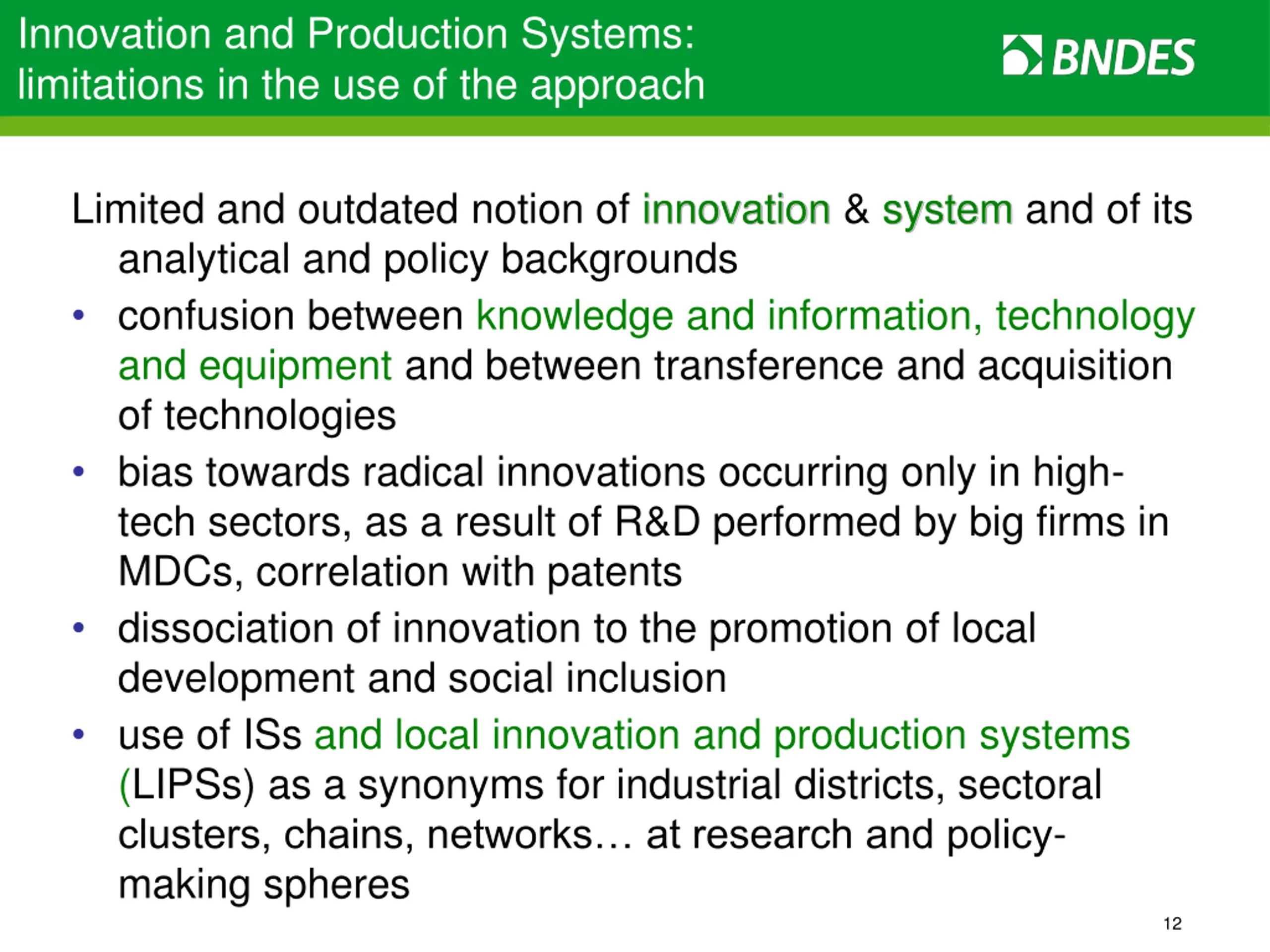 Innovation and Production Systems: limitations in the use of the approach Limited and outdated notion of innovation & system and of its analytical and policy backgrounds confusion between knowledge and information, technology and equipment and between transference and acquisition of technologies bias towards radical innovations occurring only in high- tech sectors, as a result of R&D performed by big firms in MDCs, correlation with patents dissociation of innovation to the promotion of local development and social inclusion use of ISs and local innovation and production systems (LIPSs) as a synonyms for industrial districts, sectoral clusters, chains, networks at research and policy- making spheres 12
