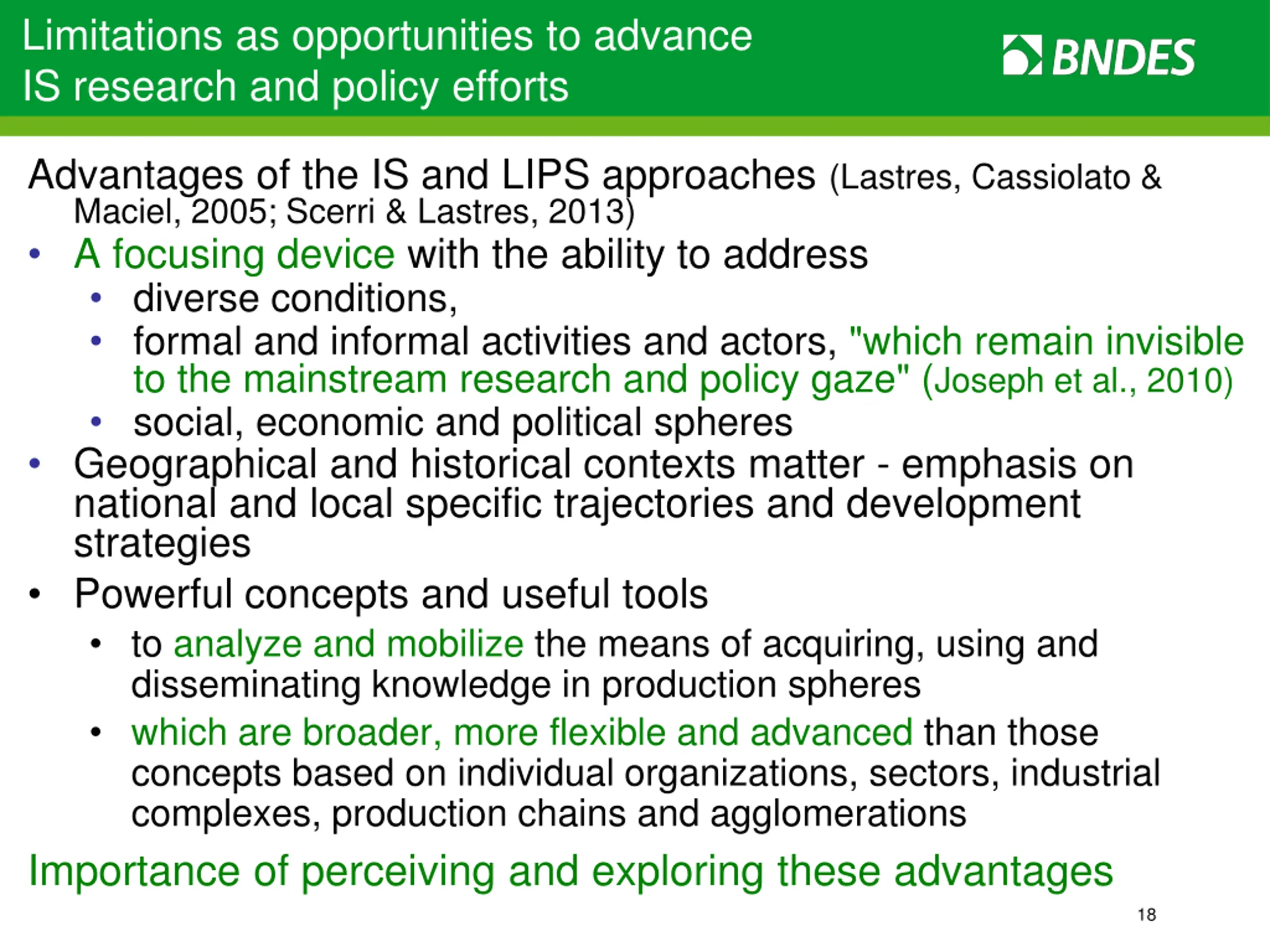 Limitations as opportunities to advance IS research and policy efforts Advantages of the IS and LIPS approaches (Lastres, Cassiolato & Maciel, 2005; Scerri & Lastres, 2013) A focusing device with the ability to address diverse conditions, formal and informal activities and actors, "which remain invisible to the mainstream research and policy gaze" (Joseph et al., 2010) social, economic and political spheres Geographical and historical contexts matter - emphasis on national and local specific trajectories and development strategies Powerful concepts and useful tools to analyze and mobilize the means of acquiring, using and disseminating knowledge in production spheres which are broader, more flexible and advanced than those concepts based on individual organizations, sectors, industrial complexes, production chains and agglomerations Importance of perceiving and exploring these advantages 18