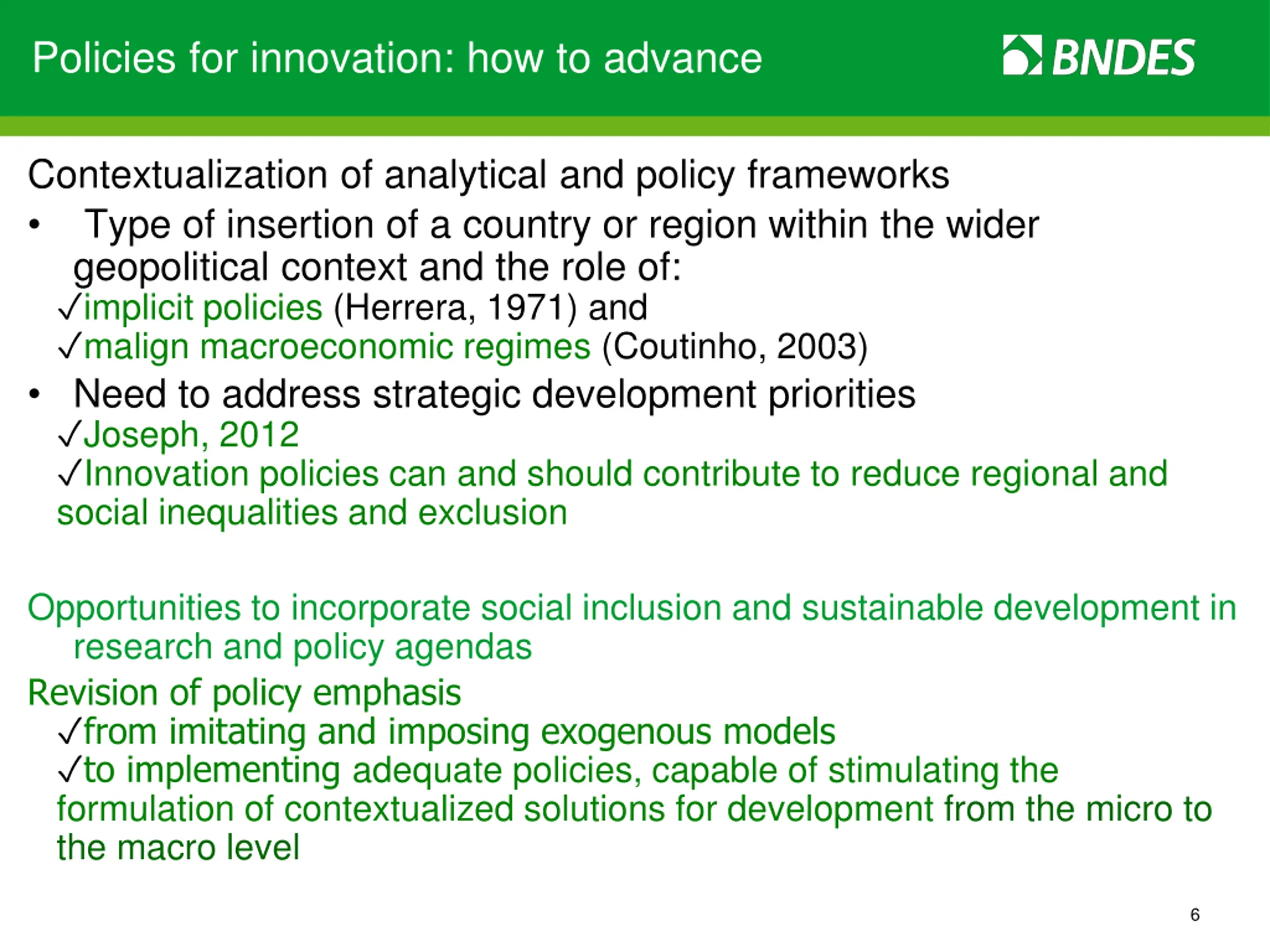 Policies for innovation: how to advance Contextualization of analytical and policy frameworks Type of insertion of a country or region within the wider geopolitical context and the role of: implicit policies (Herrera, 1971) and malign macroeconomic regimes (Coutinho, 2003) Need to address strategic development priorities Joseph, 2012 Innovation policies can and should contribute to reduce regional and social inequalities and exclusion Opportunities to incorporate social inclusion and sustainable development in research and policy agendas Revision of policy emphasis from imitating and imposing exogenous models to implementing adequate policies, capable of stimulating the formulation of contextualized solutions for development from the micro to the macro level 6
