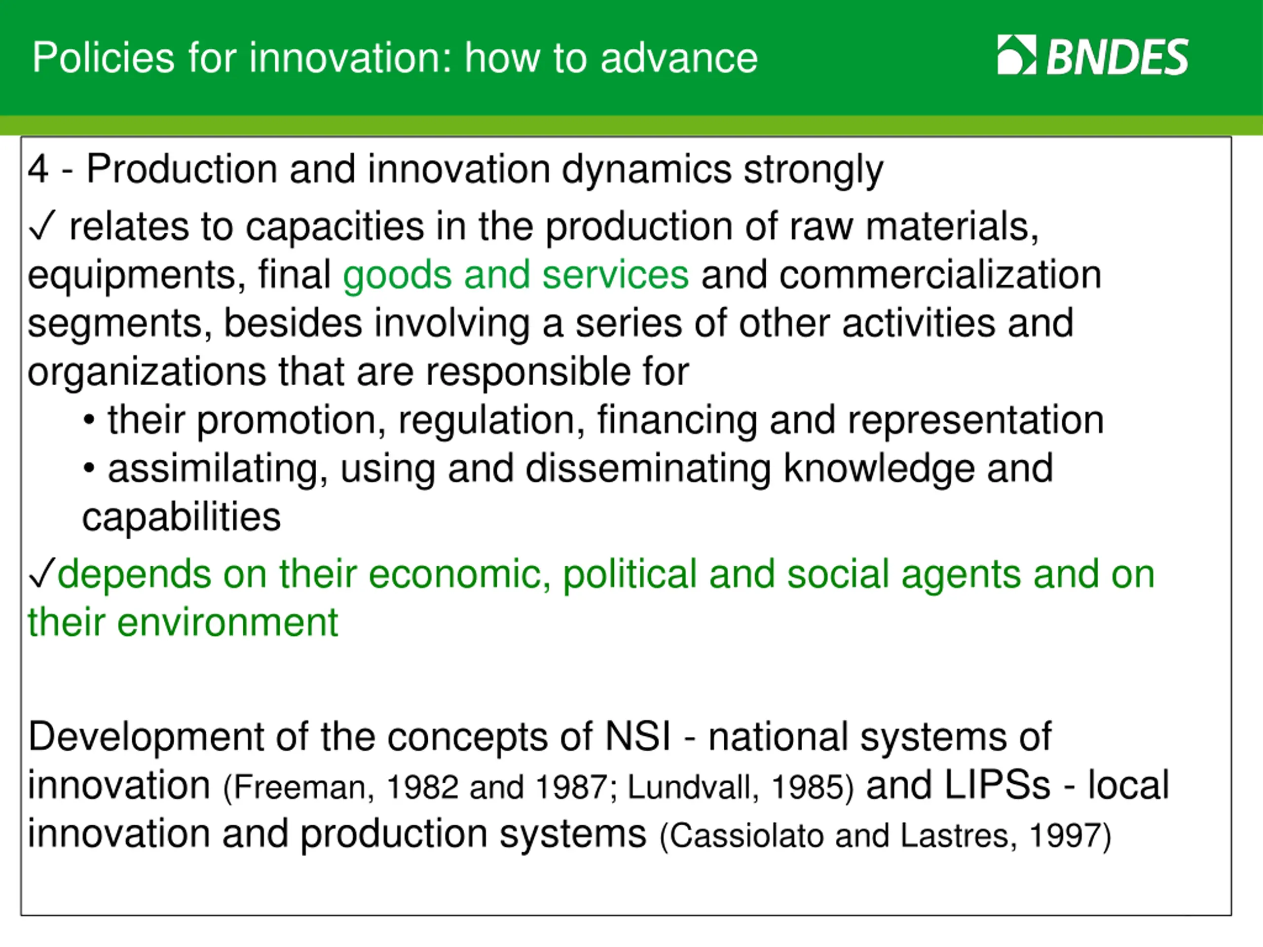 Policies for innovation: how to advance 4 - Production and innovation dynamics strongly relates to capacities in the production of raw materials, equipments, final goods and services and commercialization segments, besides involving a series of other activities and organizations that are responsible for their promotion, regulation, financing and representation assimilating, using and disseminating knowledge and capabilities depends on their economic, political and social agents and on their environment Development of the concepts of NSI - national systems of innovation (Freeman, 1982 and 1987; Lundvall, 1985) and LIPSs - local innovation and production systems (Cassiolato and Lastres, 1997) 15