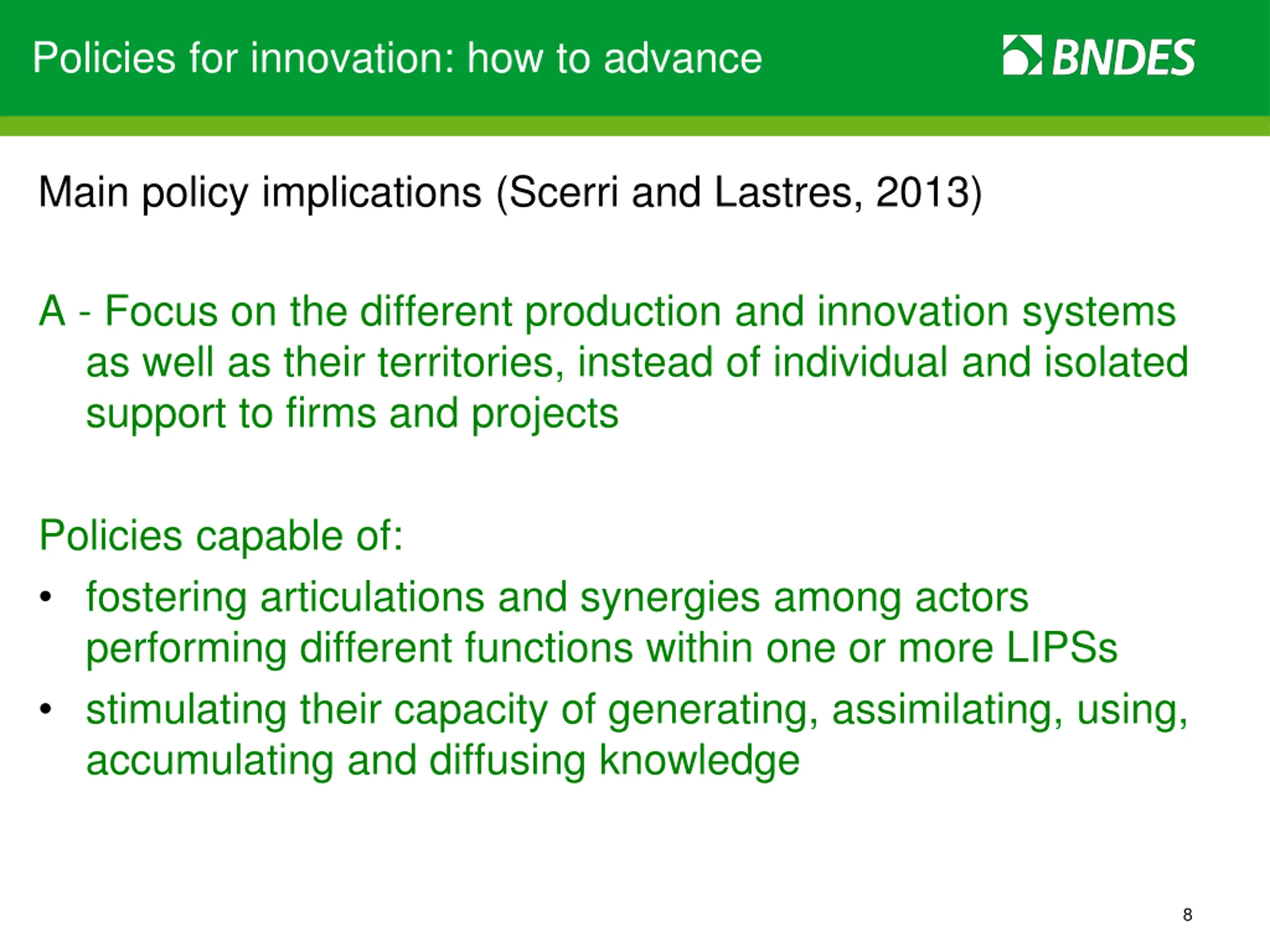 Policies for innovation: how to advance Main policy implications (Scerri and Lastres, 2013) A - Focus on the different production and innovation systems as well as their territories, instead of individual and isolated support to firms and projects Policies capable of: fostering articulations and synergies among actors performing different functions within one or more LIPSs stimulating their capacity of generating, assimilating, using, accumulating and diffusing knowledge 8