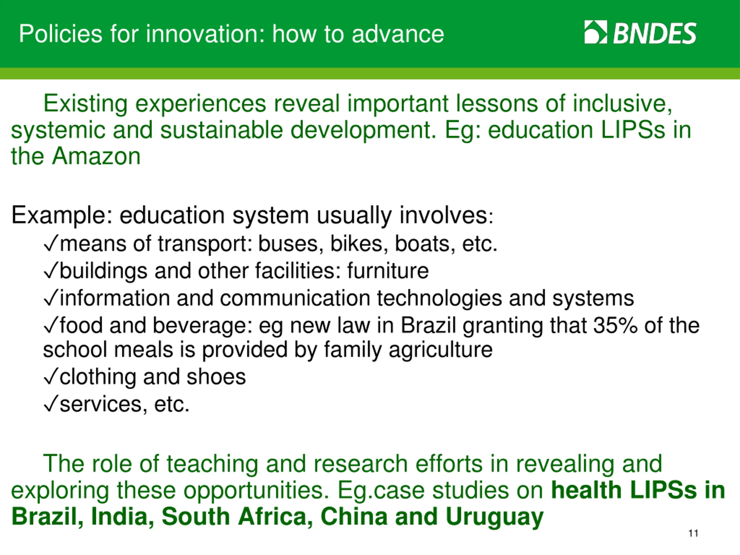 Policies for innovation: how to advance Existing experiences reveal important lessons of inclusive, systemic and sustainable development. Eg: education LIPSs in the Amazon Example: education system usually involves: means of transport: buses, bikes, boats, etc. buildings and other facilities: furniture information and communication technologies and systems food and beverage: eg new law in Brazil granting that 35% of the school meals is provided by family agriculture clothing and shoes services, etc. The role of teaching and research efforts in revealing and exploring these opportunities. Eg.case studies on health LIPSs in Brazil, India, South Africa, China and Uruguay 11