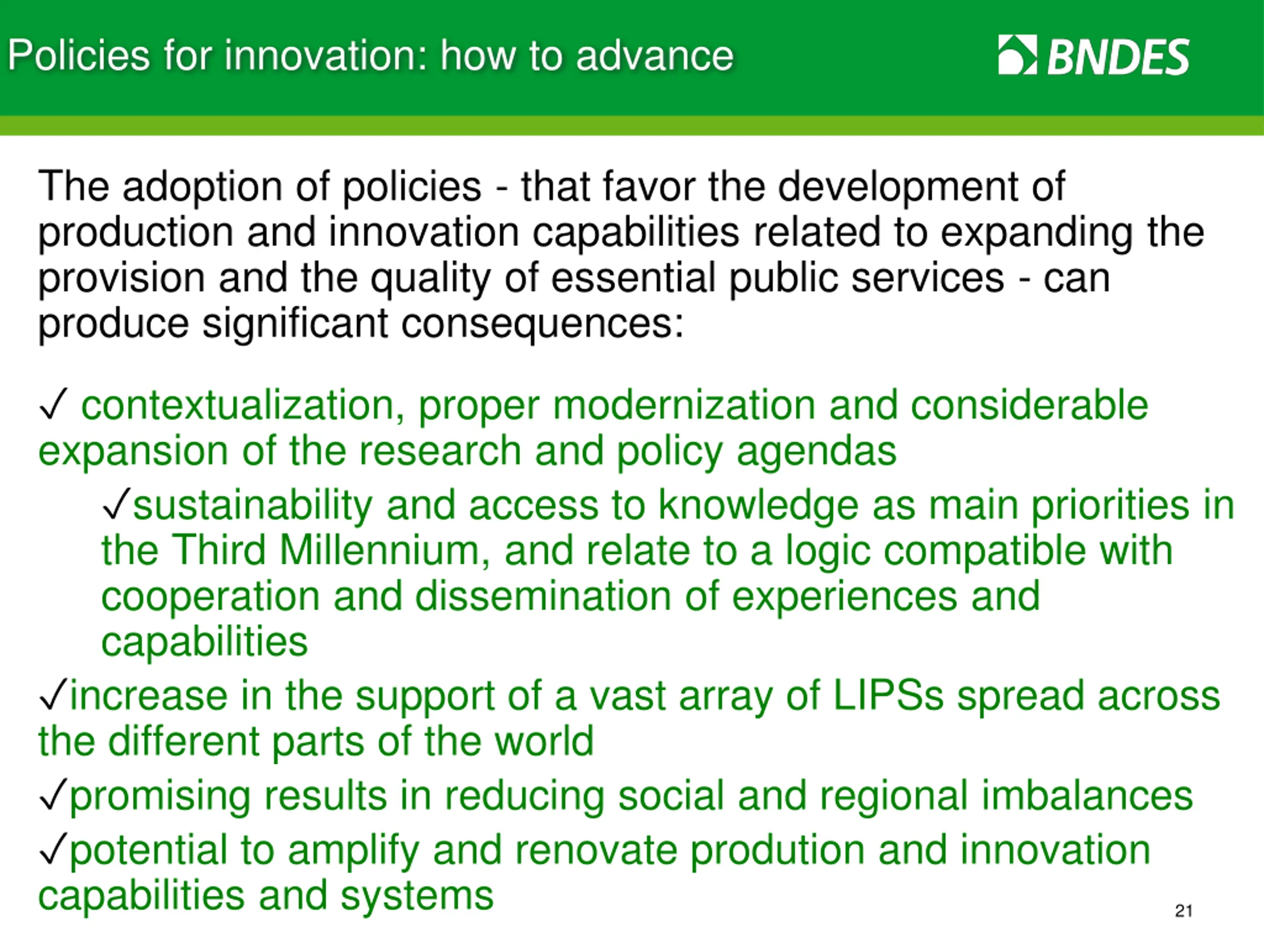 Policies for innovation: how to advance The adoption of policies - that favor the development of production and innovation capabilities related to expanding the provision and the quality of essential public services - can produce significant consequences: contextualization, proper modernization and considerable expansion of the research and policy agendas sustainability and access to knowledge as main priorities in the Third Millennium, and relate to a logic compatible with cooperation and dissemination of experiences and capabilities increase in the support of a vast array of LIPSs spread across the different parts of the world promising results in reducing social and regional imbalances potential to amplify and renovate prodution and innovation capabilities and systems 21