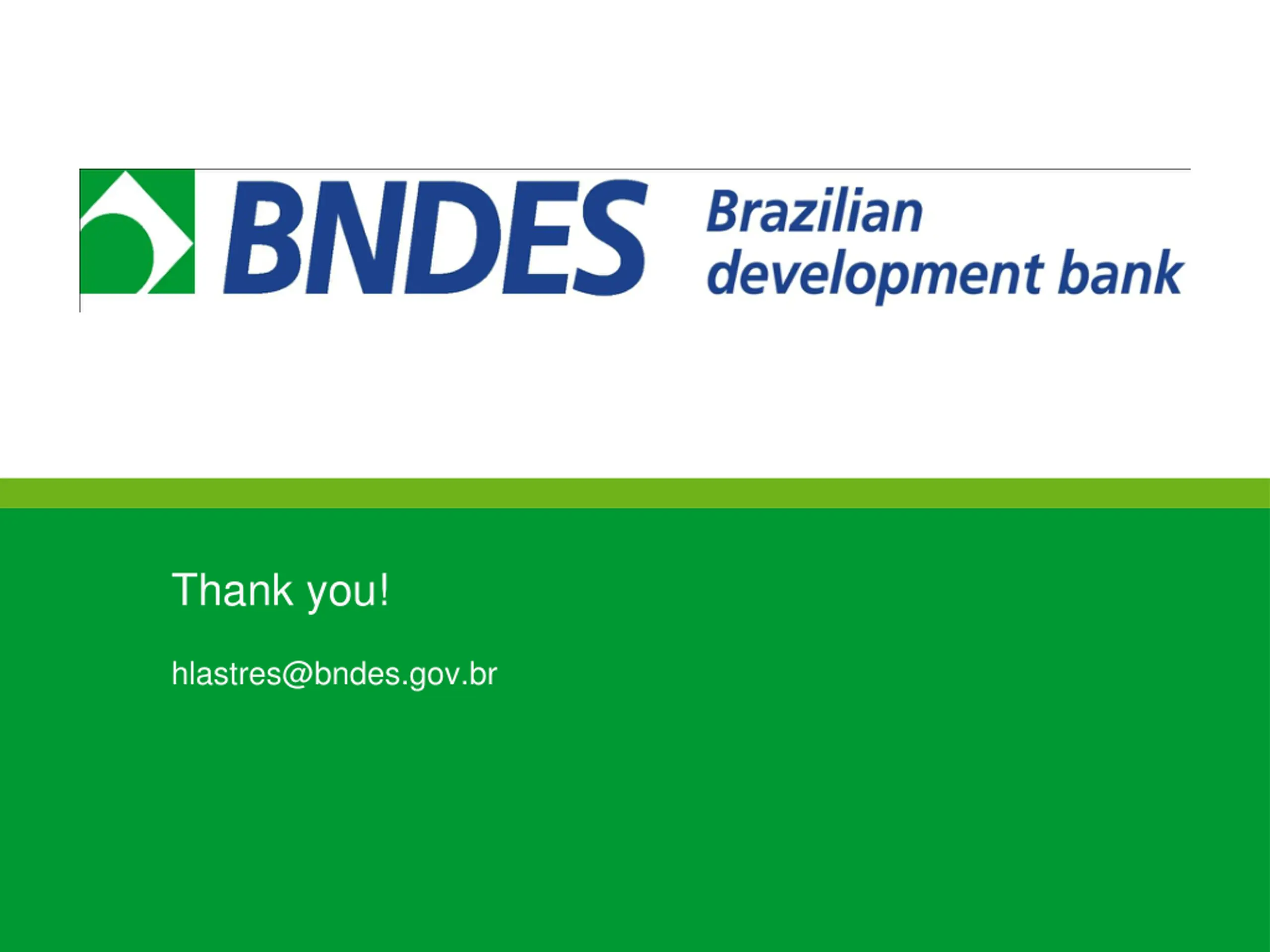 BNDES on Social Medias YOUTUBE www.youtube.com/bndesgovbr SLIDESHARE www.slideshare.net/bndes TWITTER twitter.com/bndes_imprensa FACEBOOK www.facebook.com/bndes.imprensa