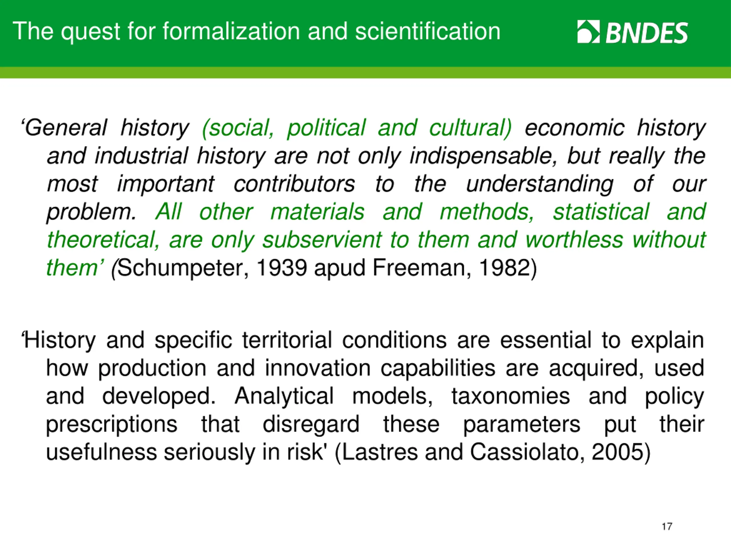 The quest for formalization and scientification General history (social, political and cultural) economic history and industrial history are not only indispensable, but really the most important contributors to the understanding of our problem. All other materials and methods, statistical and theoretical, are only subservient to them and worthless without them (Schumpeter, 1939 apud Freeman, 1982) History and specific territorial conditions are essential to explain how production and innovation capabilities are acquired, used and developed. Analytical models, taxonomies and policy prescriptions that disregard these parameters put their usefulness seriously in risk' (Lastres and Cassiolato, 2005) 17