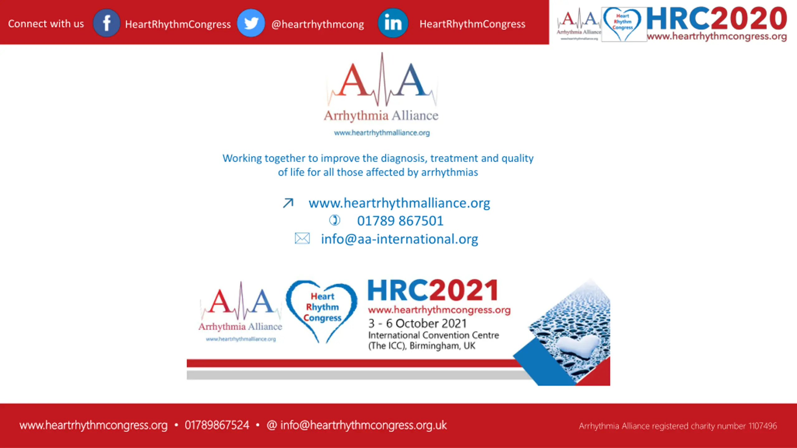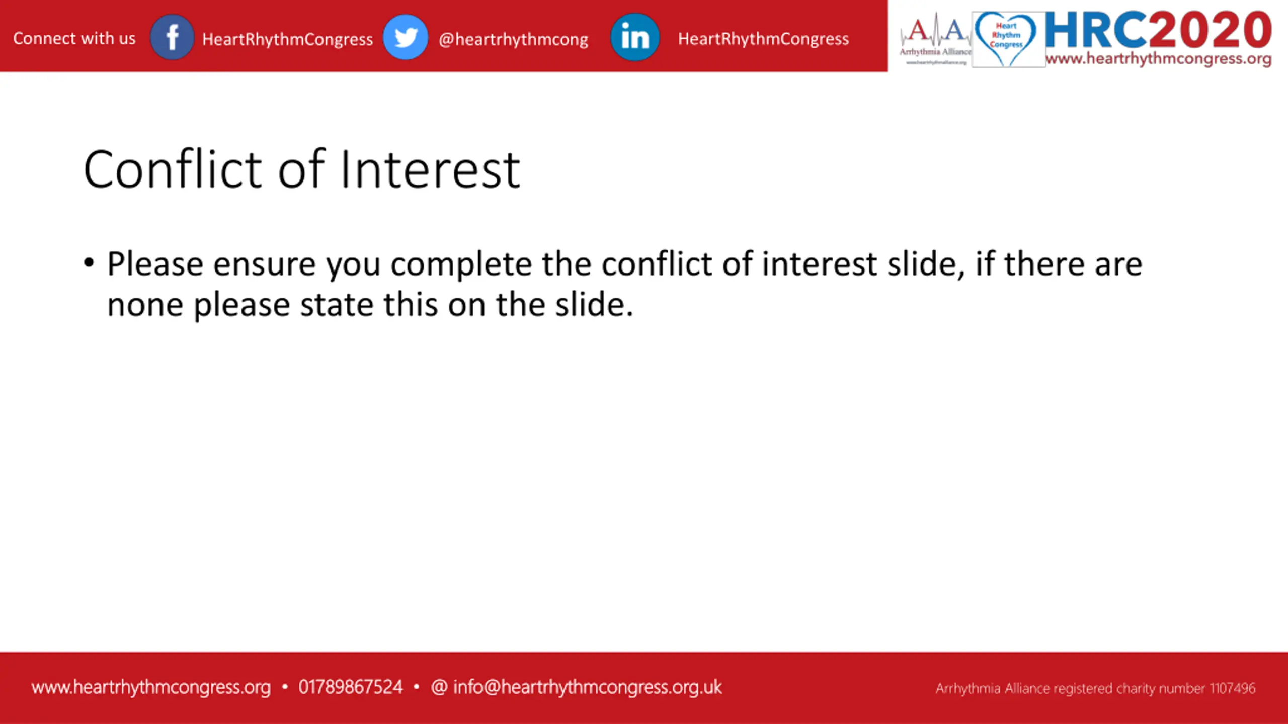 Connect with us HeartRhythmCongress HeartRhythmCongress @heartrhythmcong Conflict of Interest Please ensure you complete the conflict of interest slide, if there are none please state this on the slide. www.heartrhythmcongress.org 01789867524 @ info@heartrhythmcongress.org.uk www.heartrhythmcongress.org 01789867524 @ info@heartrhythmcongress.org.uk Arrhythmia Alliance registered charity number 1107496