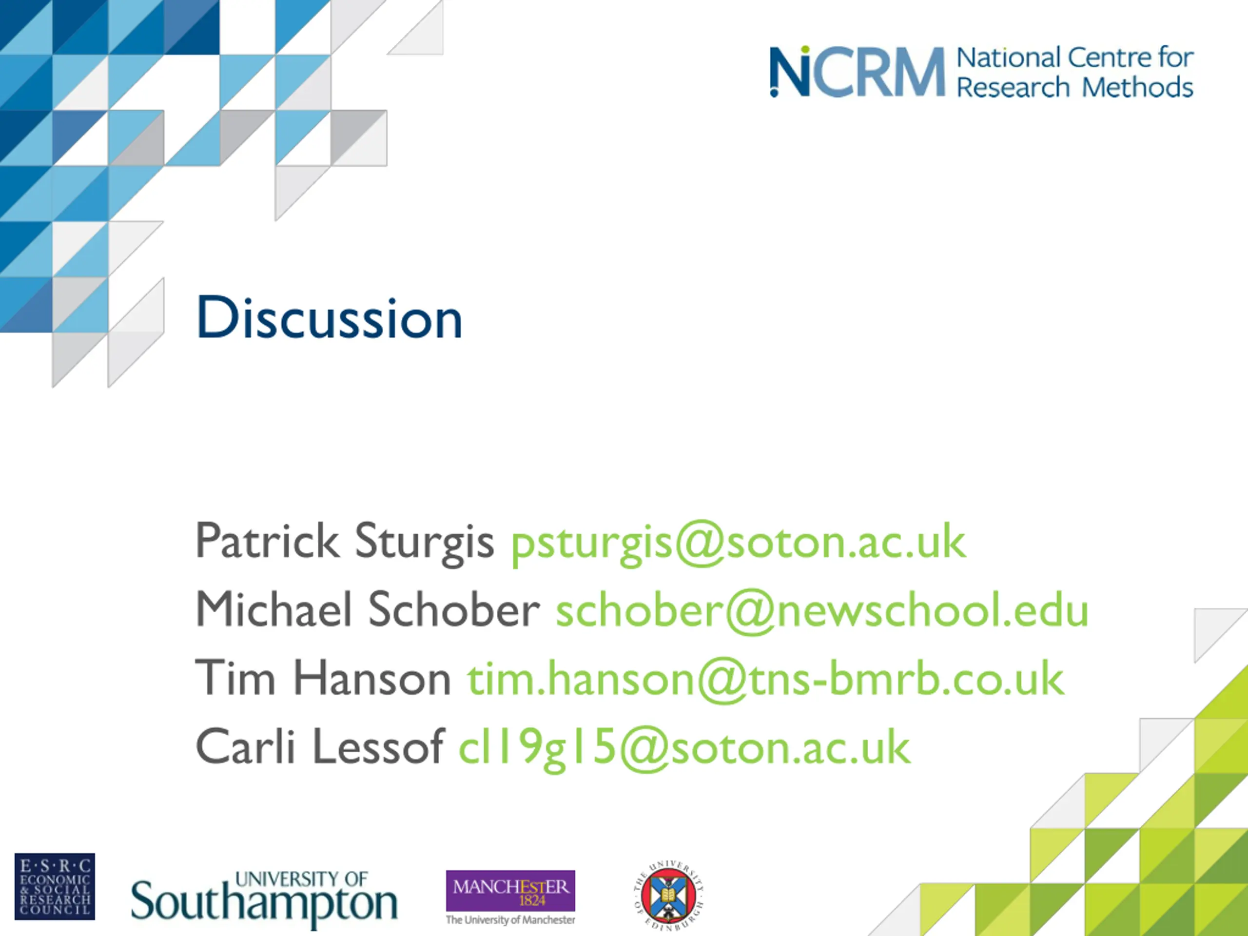 Discussion Patrick Sturgis psturgis@soton.ac.uk Michael Schober schober@newschool.edu Tim Hanson tim.hanson@tns-bmrb.co.uk Carli Lessof cl19g15@soton.ac.uk