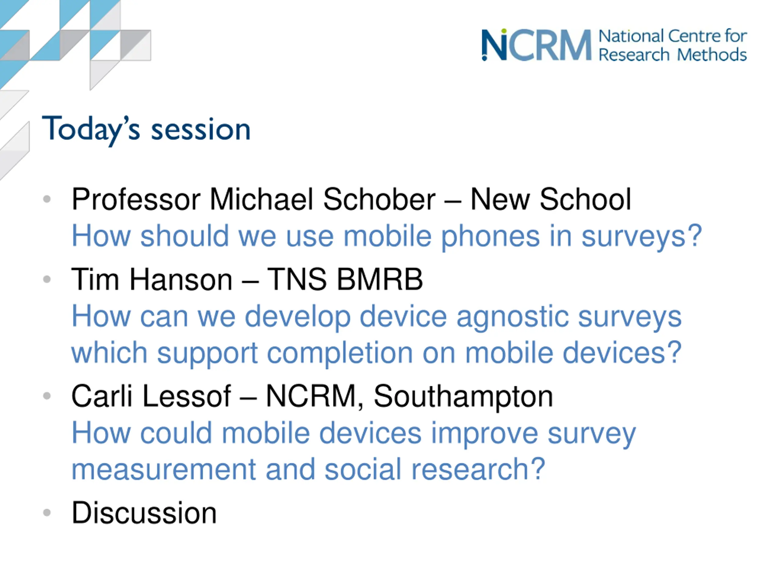 Todays session Professor Michael Schober New School How should we use mobile phones in surveys? Tim Hanson TNS BMRB How can we develop device agnostic surveys which support completion on mobile devices? Carli Lessof NCRM, Southampton How could mobile devices improve survey measurement and social research? Discussion