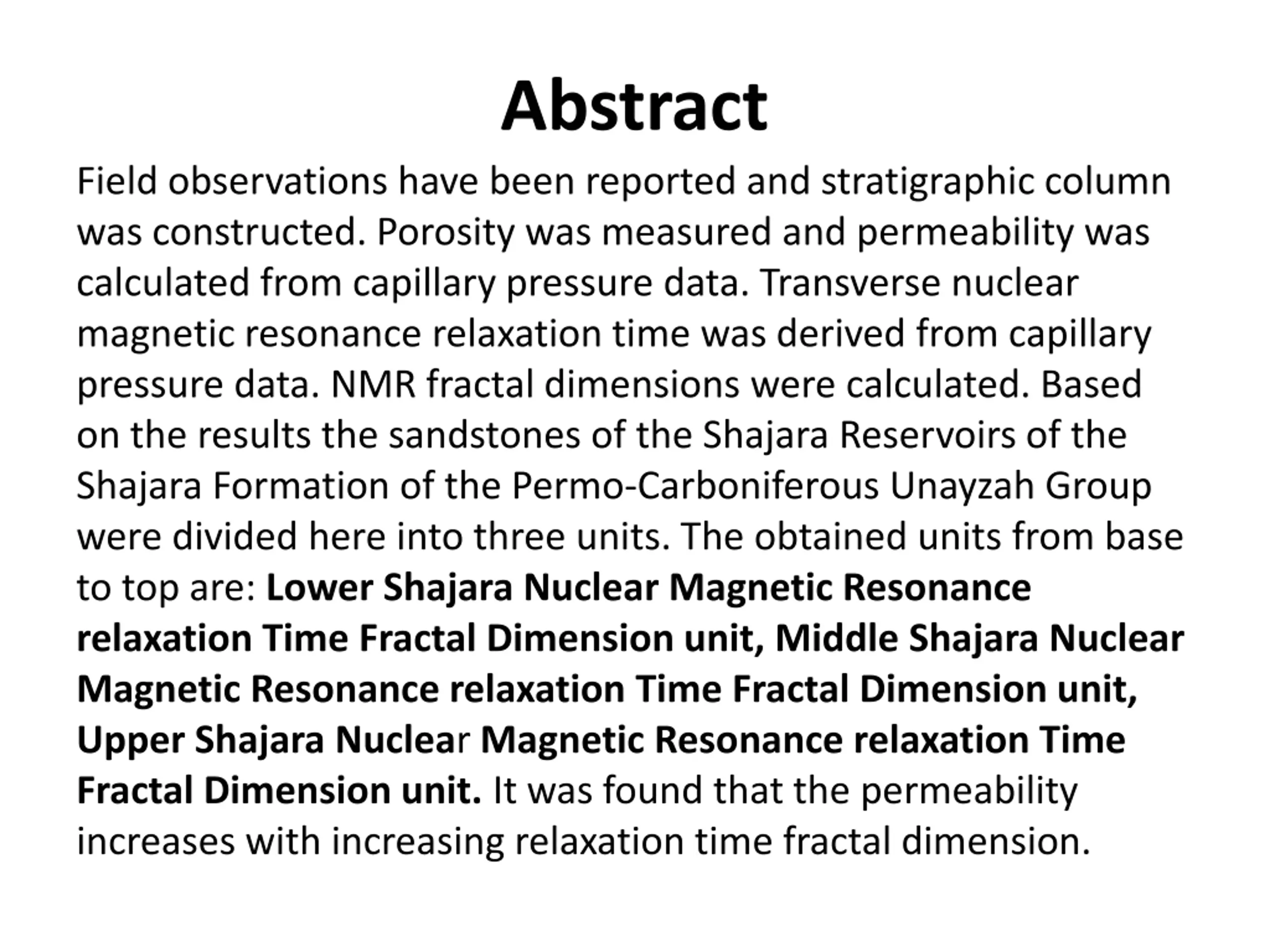 Conclusions The sandstones of the Shajara Reservoirs of the Shajara formation of the permo-Carboniferous unayzah group were divided here into three units based on nuclear magnetic resonance transverse relaxation time. The transverse time nuclear magnetic resonance fractal dimension increases with increasing permeability. The fractal dimension also increases with increasing grain size due to the presence of interconnected channels.