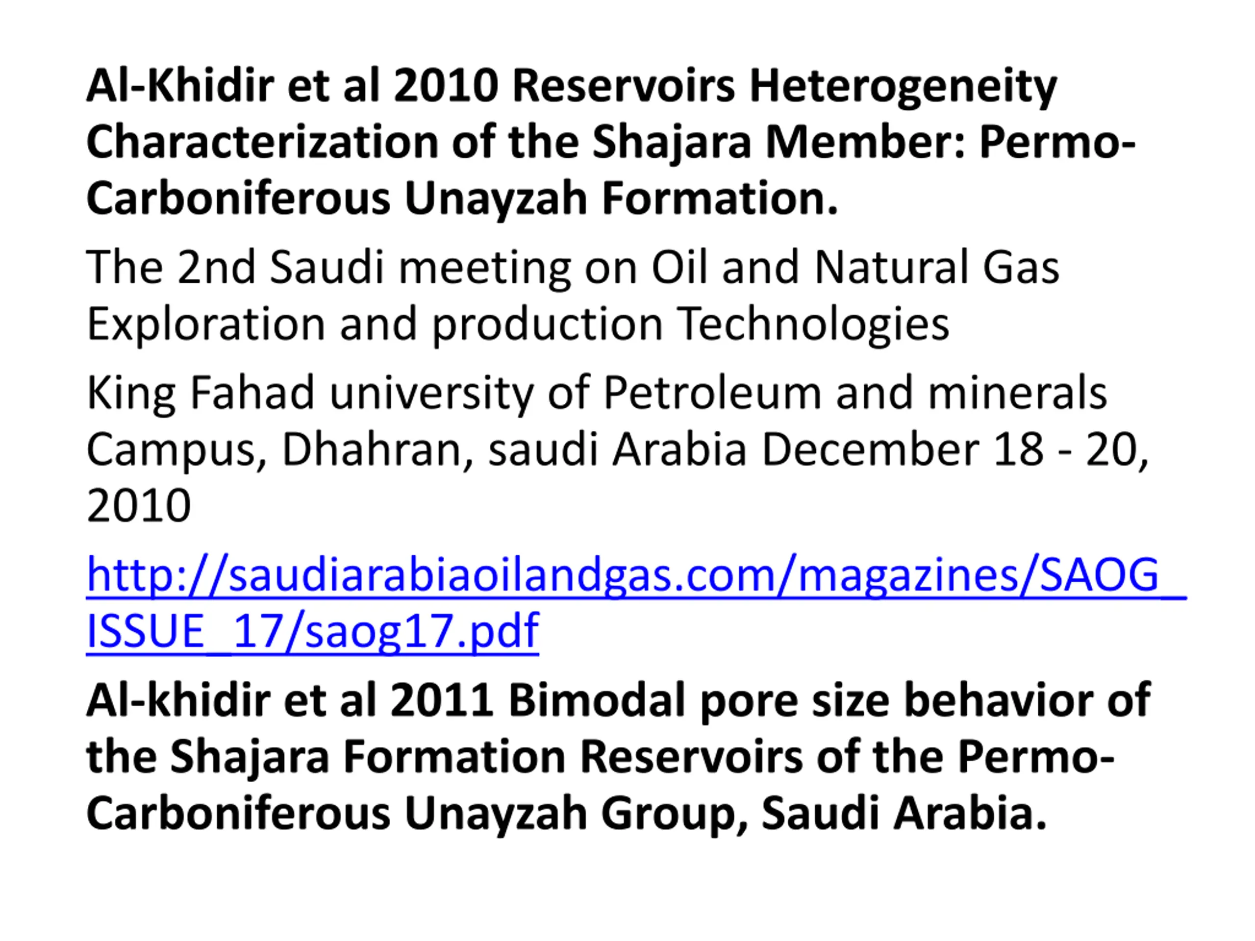 Al-Khidir et al 2010 Reservoirs Heterogeneity Characterization of the Shajara Member: Permo- Carboniferous Unayzah Formation. The 2nd Saudi meeting on Oil and Natural Gas Exploration and production Technologies King Fahad university of Petroleum and minerals Campus, Dhahran, saudi Arabia December 18 - 20, 2010 http://saudiarabiaoilandgas.com/magazines/SAOG_ ISSUE_17/saog17.pdf Al-khidir et al 2011 Bimodal pore size behavior of the Shajara Formation Reservoirs of the Permo- Carboniferous Unayzah Group, Saudi Arabia.