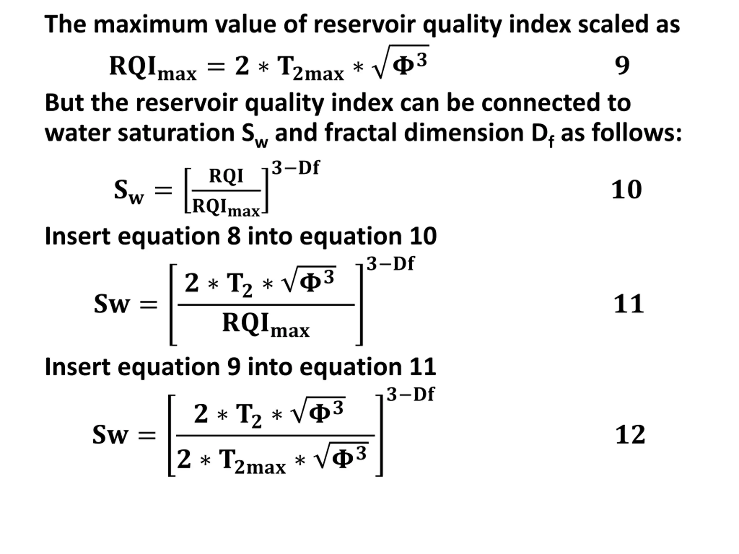 The maximum value of reservoir quality index scaled as ??????= ? ????? But the reservoir quality index can be connected to water saturation Swand fractal dimension Dfas follows: ? ?? ?? ? ??? ?????? ??= ?? Insert equation 8 into equation 10 ? ?? ? ?? ?? ?????? ?? = ?? Insert equation 9 into equation 11 ? ?? ? ?? ?? ? ????? ?? ?? = ??