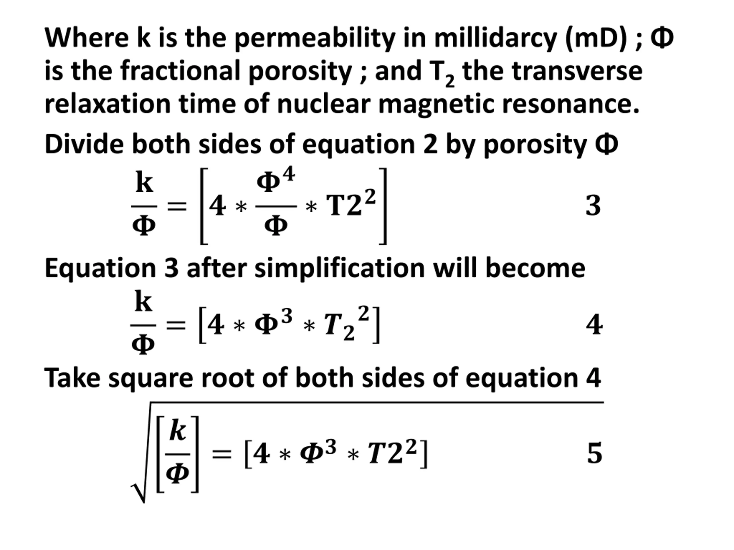 Where k is the permeability in millidarcy (mD) ; is the fractional porosity ; and T2the transverse relaxation time of nuclear magnetic resonance. Divide both sides of equation 2 by porosity ? ?= ? ?? Equation 3 after simplification will become ? ?= ? ?? ??? Take square root of both sides of equation 4 ? ??? ? ? ? ? = ? ?? ??? ?