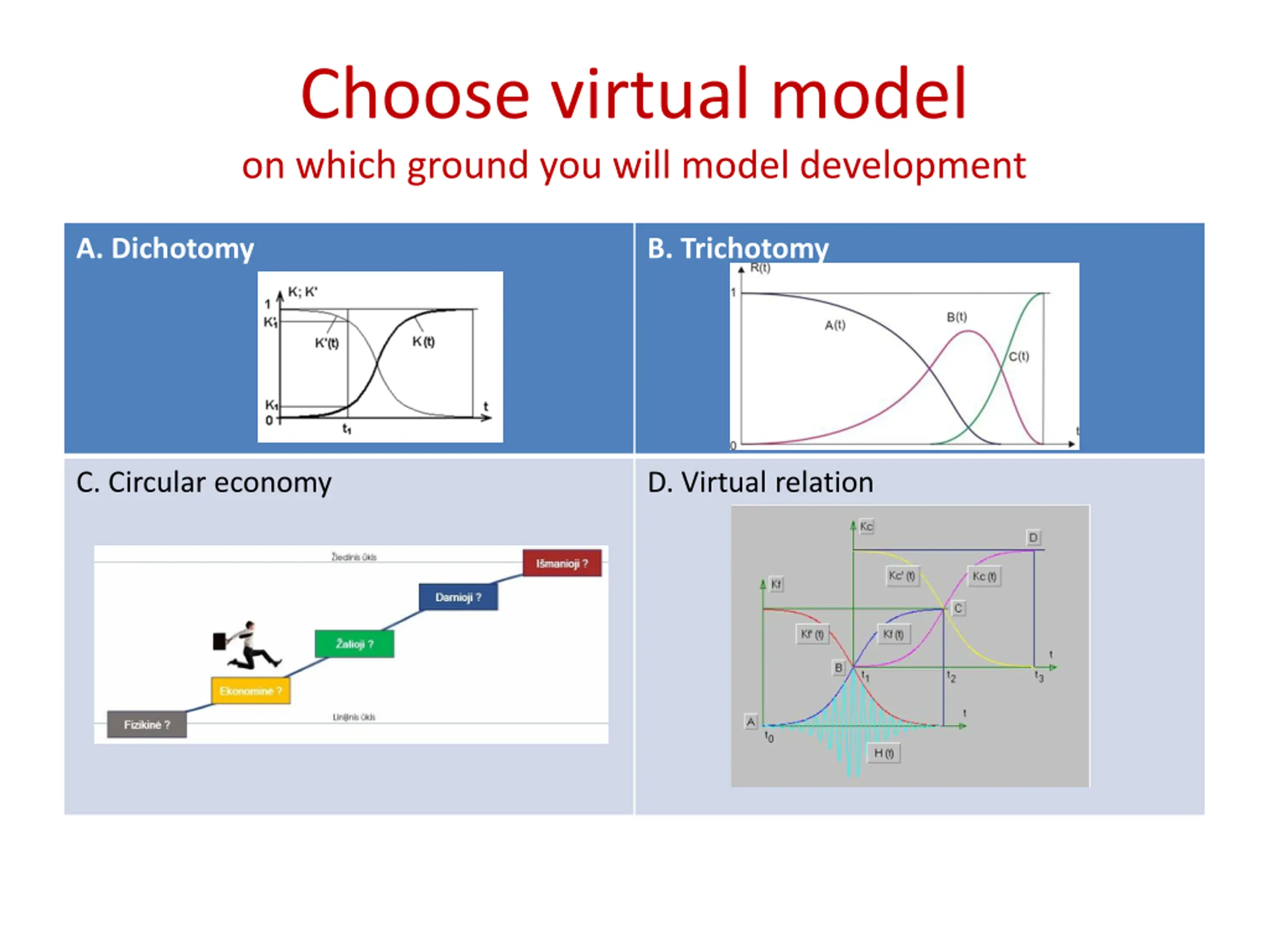 Choose virtual model on which ground you will model development A. Dichotomy B. Trichotomy C. Circular economy D. Virtual relation