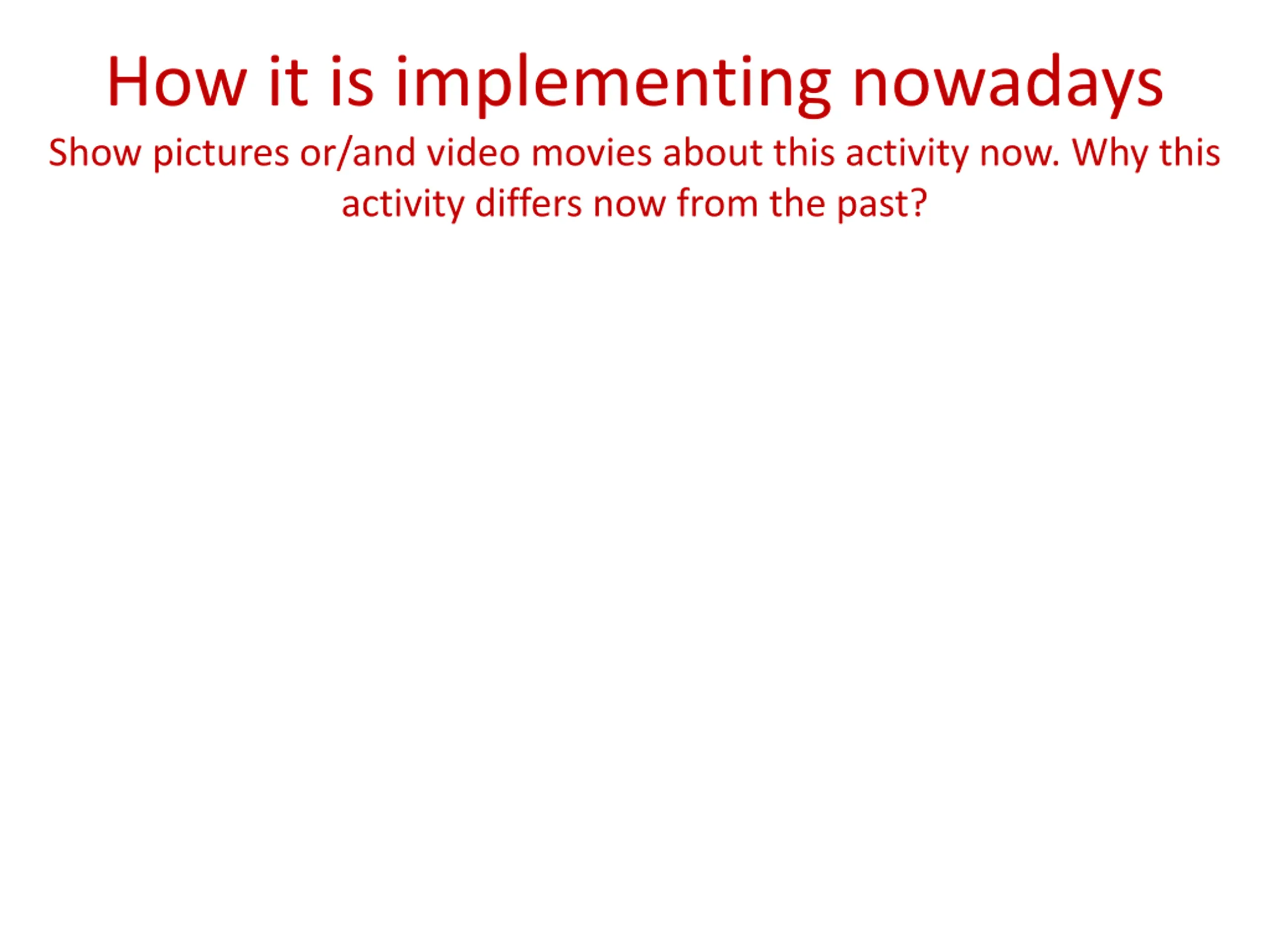 How it is implementing nowadays Show pictures or/and video movies about this activity now. Why this activity differs now from the past?