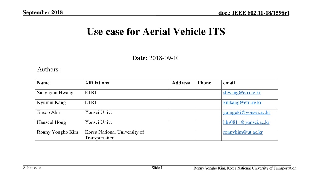 September 2018 doc.: IEEE 802.11-18/1598r1 Use case for Aerial Vehicle ITS Date: 2018-09-10 Authors: Name Affiliations Address Phone email Sunghyun Hwang ETRI shwang@etri.re.kr Kyumin Kang ETRI kmkang@etri.re.kr Jinsoo Ahn Yonsei Univ. gumgoki@yonsei.ac.kr Hanseul Hong Yonsei Univ. hhs0811@yonsei.ac.kr Ronny Yongho Kim Korea National University of Transportation ronnykim@ut.ac.kr Submission Slide 1 Ronny Yongho Kim, Korea National University of Transportation