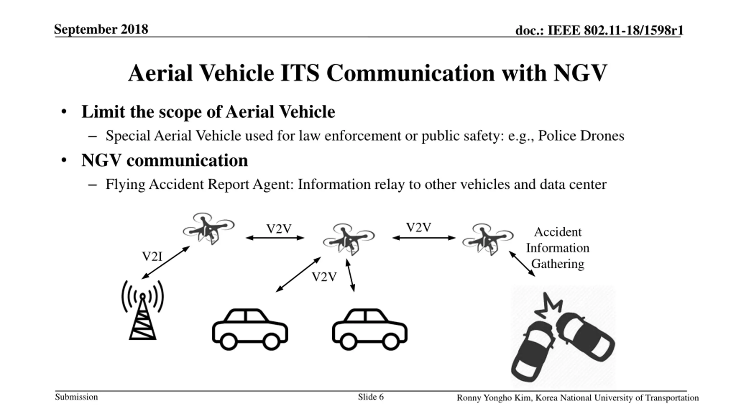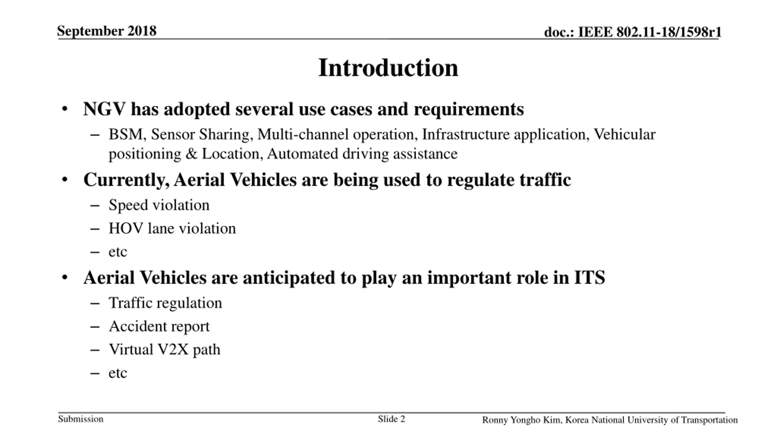 September 2018 doc.: IEEE 802.11-18/1598r1 Introduction NGV has adopted several use cases and requirements BSM, Sensor Sharing, Multi-channel operation, Infrastructure application, Vehicular positioning & Location, Automated driving assistance Currently, Aerial Vehicles are being used to regulate traffic Speed violation HOV lane violation etc Aerial Vehicles are anticipated to play an important role in ITS Traffic regulation Accident report Virtual V2X path etc Submission Slide 2 Ronny Yongho Kim, Korea National University of Transportation