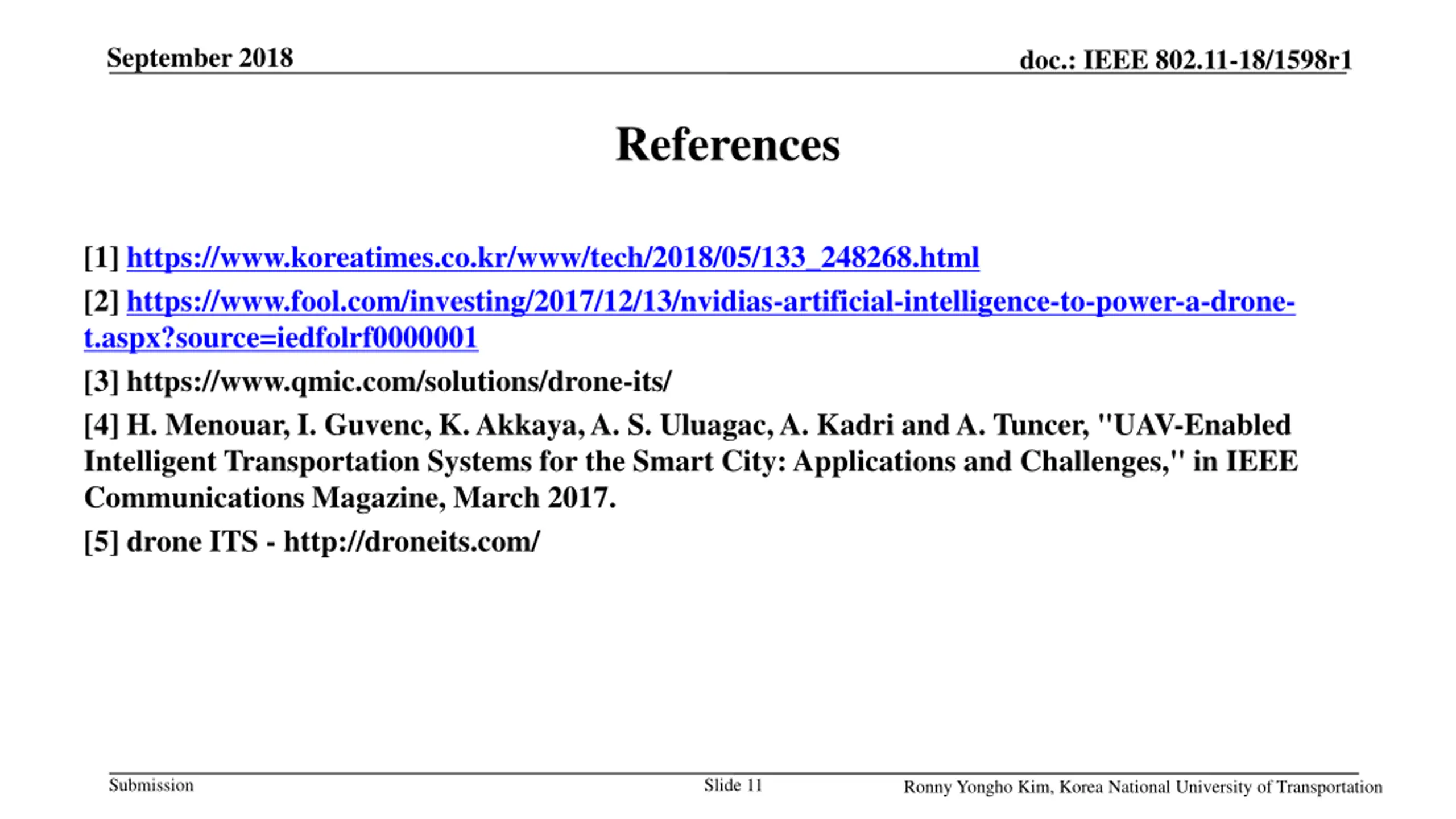 September 2018 doc.: IEEE 802.11-18/1598r1 References [1] https://www.koreatimes.co.kr/www/tech/2018/05/133_248268.html [2] https://www.fool.com/investing/2017/12/13/nvidias-artificial-intelligence-to-power-a-drone- t.aspx?source=iedfolrf0000001 [3] https://www.qmic.com/solutions/drone-its/ [4] H. Menouar, I. Guvenc, K. Akkaya, A. S. Uluagac, A. Kadri and A. Tuncer, "UAV-Enabled Intelligent Transportation Systems for the Smart City: Applications and Challenges," in IEEE Communications Magazine, March 2017. [5] drone ITS - http://droneits.com/ Submission Slide 11 Ronny Yongho Kim, Korea National University of Transportation