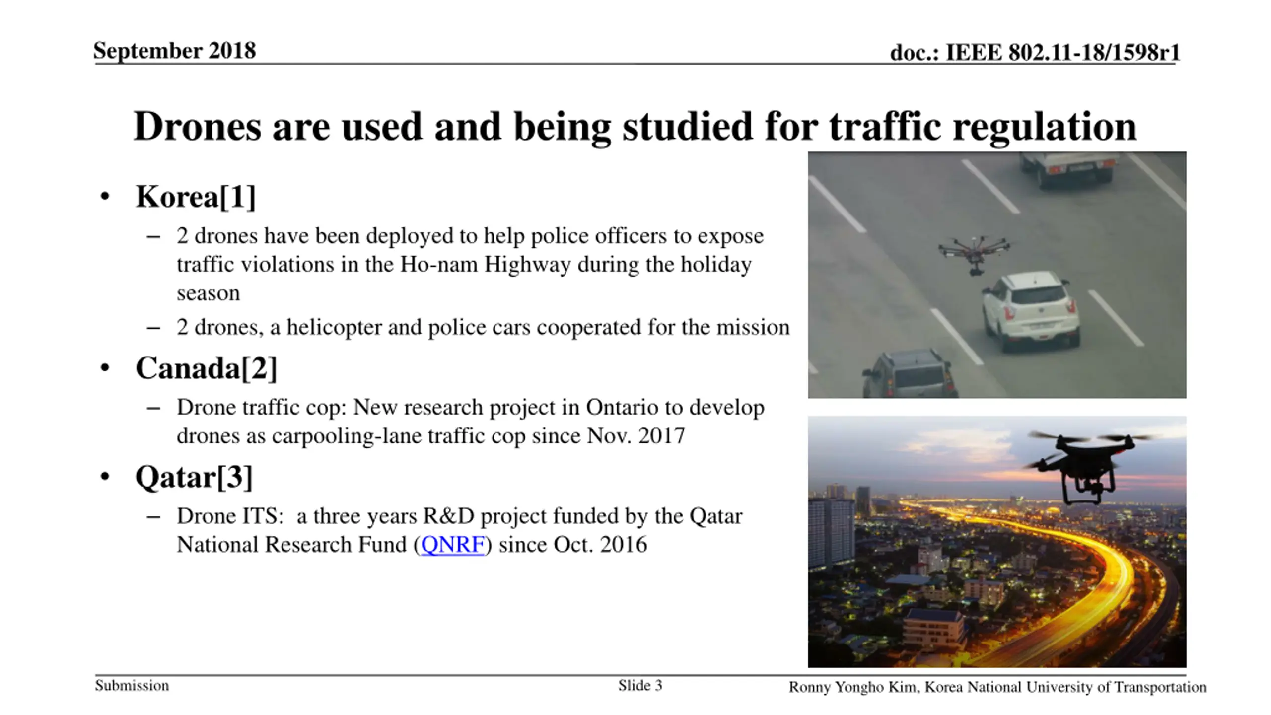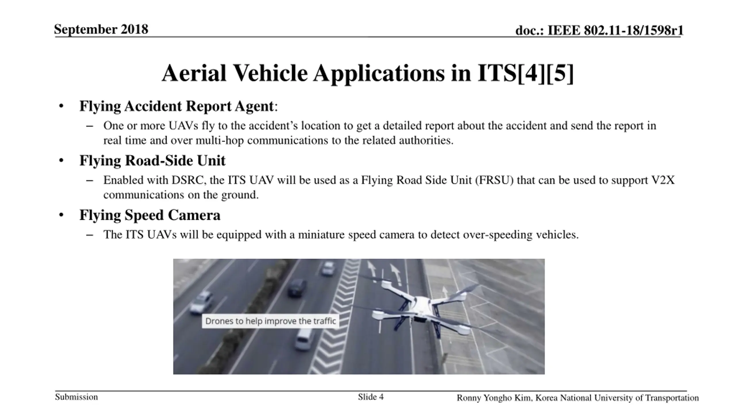 September 2018 doc.: IEEE 802.11-18/1598r1 Drones are used and being studied for traffic regulation Korea[1] 2 drones have been deployed to help police officers to expose traffic violations in the Ho-nam Highway during the holiday season 2 drones, a helicopter and police cars cooperated for the mission Canada[2] Drone traffic cop: New research project in Ontario to develop drones as carpooling-lane traffic cop since Nov. 2017 Qatar[3] Drone ITS: a three years R&D project funded by the Qatar National Research Fund (QNRF) since Oct. 2016 Submission Slide 3 Ronny Yongho Kim, Korea National University of Transportation