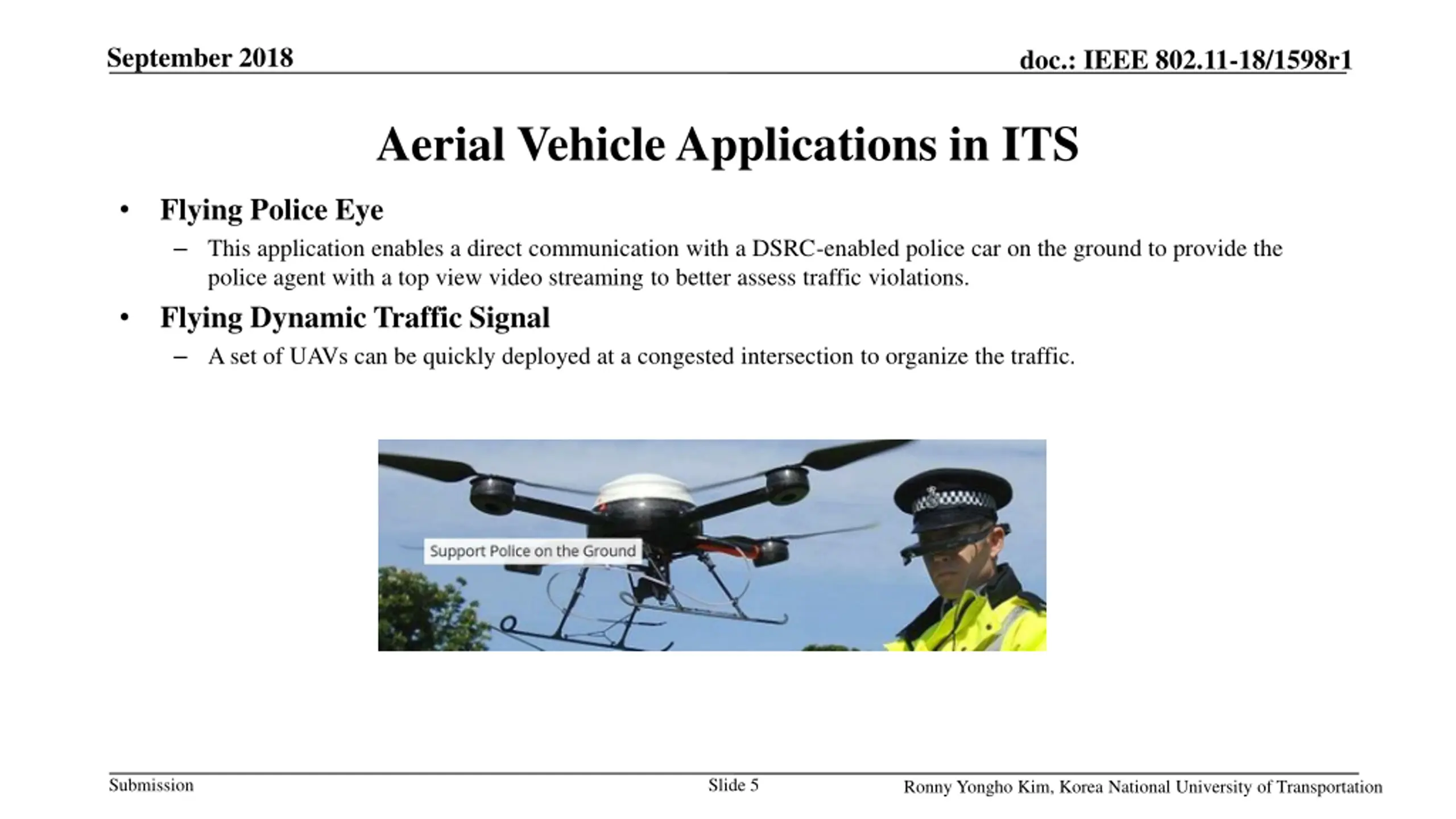 September 2018 doc.: IEEE 802.11-18/1598r1 Aerial Vehicle Applications in ITS[4][5] Flying Accident Report Agent: One or more UAVs fly to the accident s location to get a detailed report about the accident and send the report in real time and over multi-hop communications to the related authorities. Flying Road-Side Unit Enabled with DSRC, the ITS UAV will be used as a Flying Road Side Unit (FRSU) that can be used to support V2X communications on the ground. Flying Speed Camera The ITS UAVs will be equipped with a miniature speed camera to detect over-speeding vehicles. Submission Slide 4 Ronny Yongho Kim, Korea National University of Transportation
