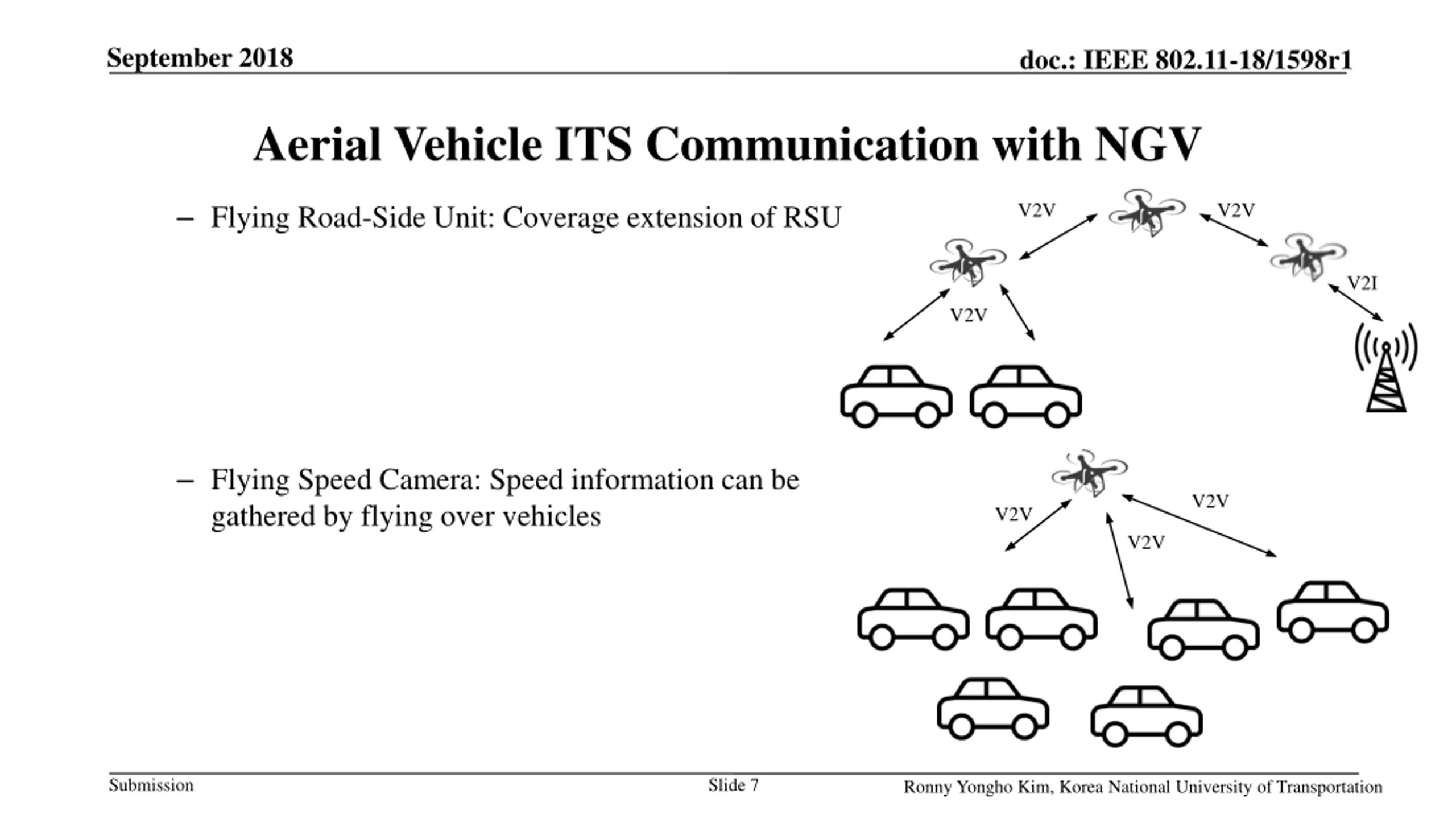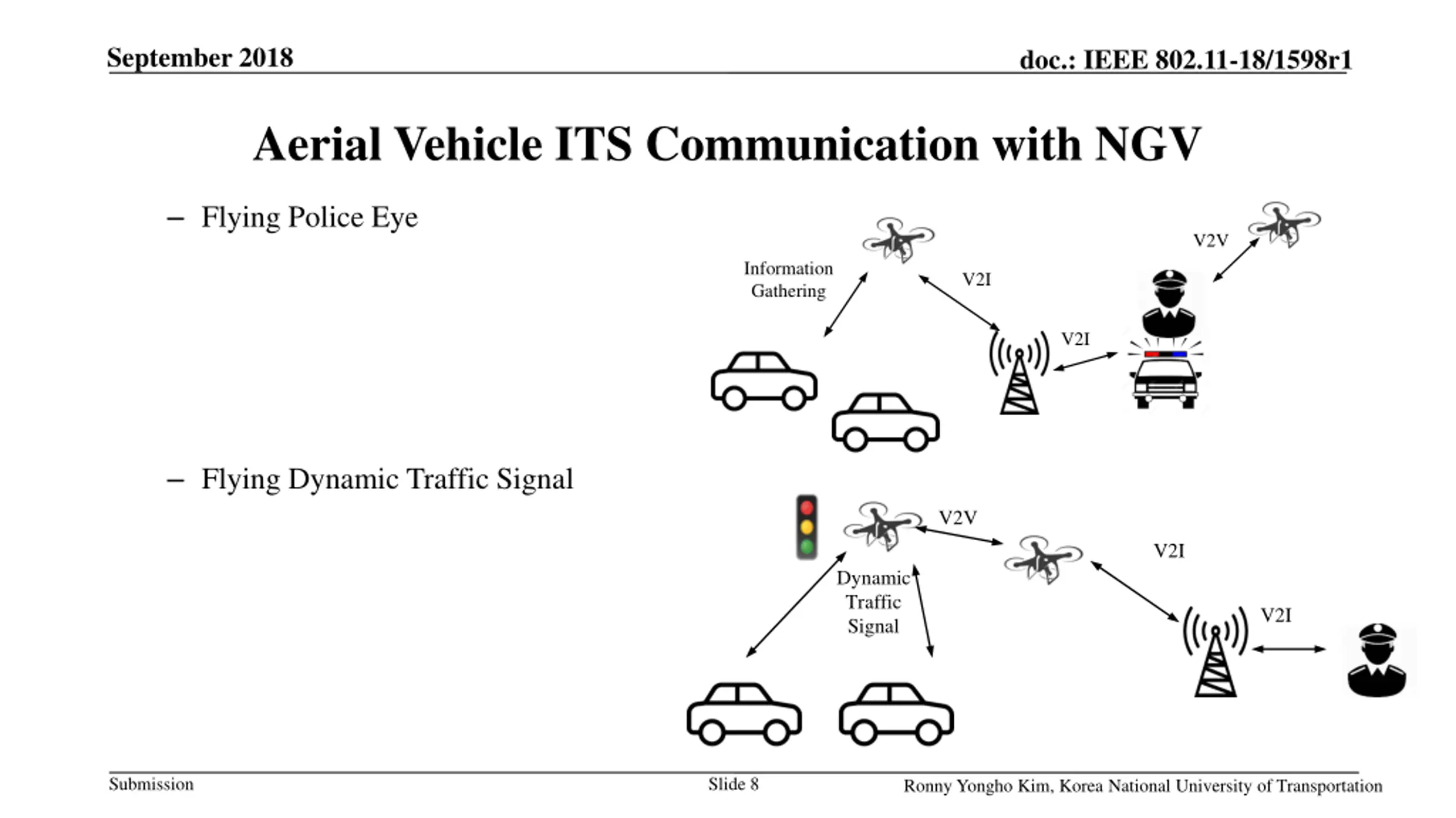 September 2018 doc.: IEEE 802.11-18/1598r1 Aerial Vehicle ITS Communication with NGV Flying Police Eye V2V Information Gathering V2I V2I Flying Dynamic Traffic Signal V2V V2I Dynamic Traffic Signal V2I Submission Slide 8 Ronny Yongho Kim, Korea National University of Transportation