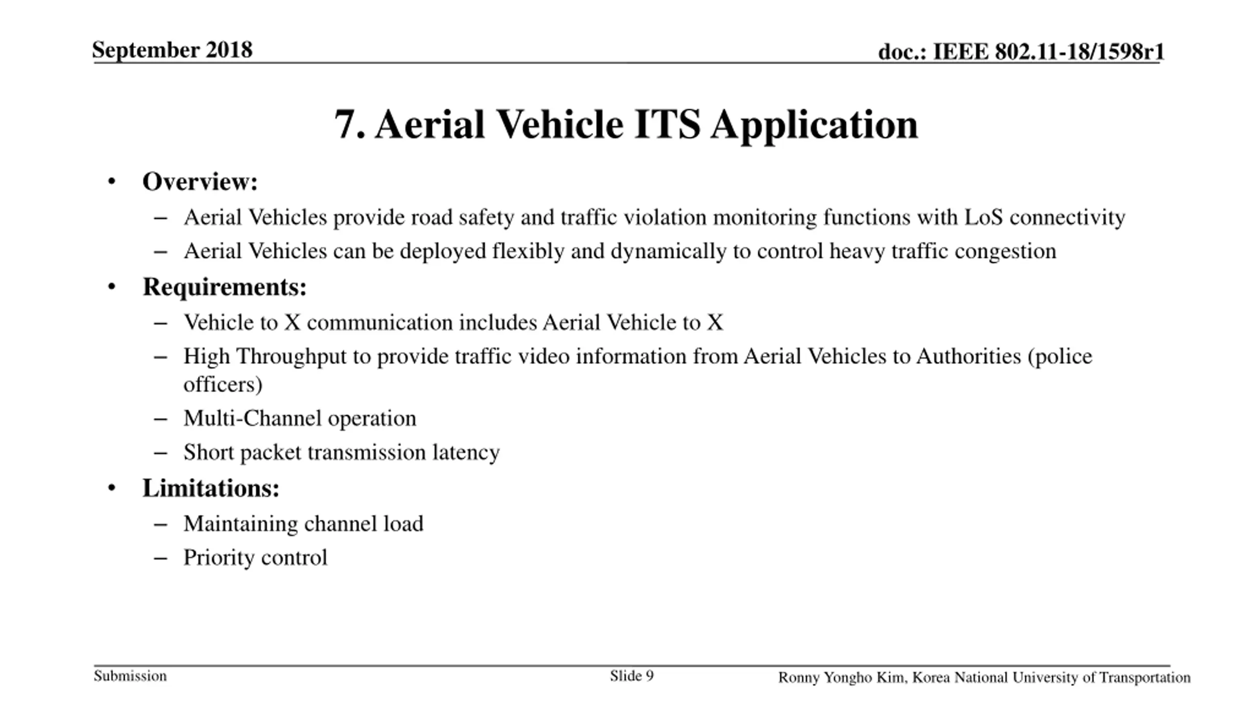September 2018 doc.: IEEE 802.11-18/1598r1 7. Aerial Vehicle ITS Application Overview: Aerial Vehicles provide road safety and traffic violation monitoring functions with LoS connectivity Aerial Vehicles can be deployed flexibly and dynamically to control heavy traffic congestion Requirements: Vehicle to X communication includes Aerial Vehicle to X High Throughput to provide traffic video information from Aerial Vehicles to Authorities (police officers) Multi-Channel operation Short packet transmission latency Limitations: Maintaining channel load Priority control Submission Slide 9 Ronny Yongho Kim, Korea National University of Transportation
