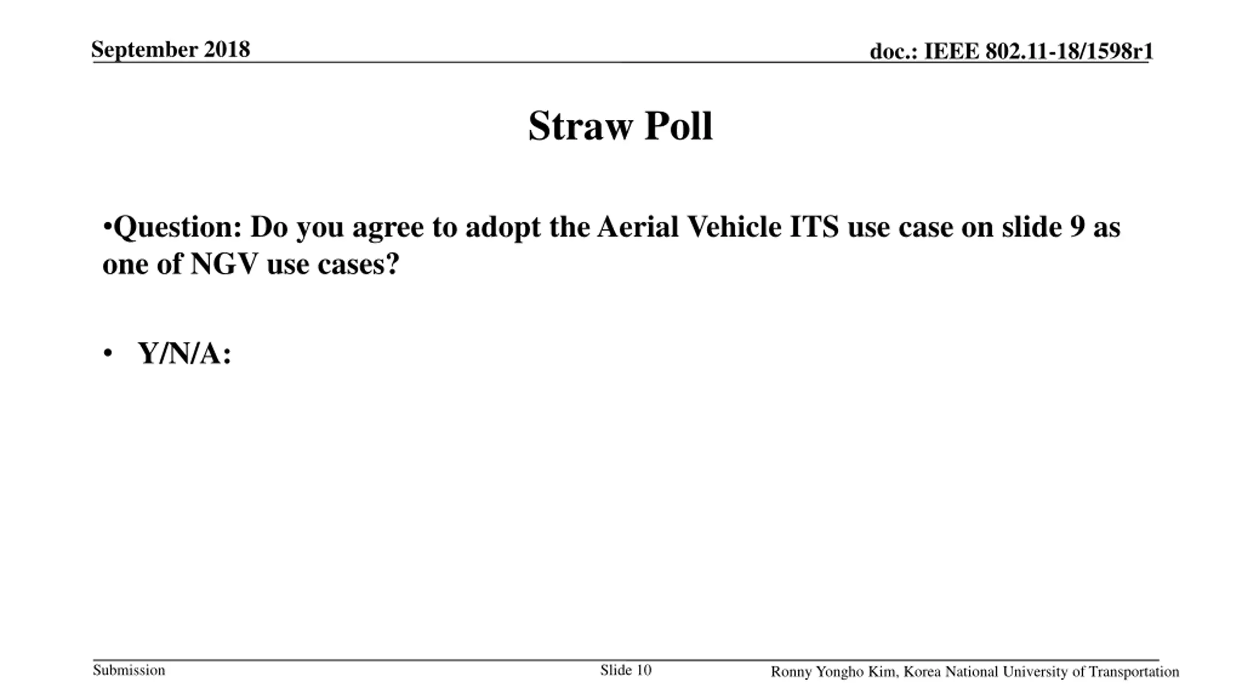September 2018 doc.: IEEE 802.11-18/1598r1 Straw Poll Question: Do you agree to adopt the Aerial Vehicle ITS use case on slide 9 as one of NGV use cases? Y/N/A: Submission Slide 10 Ronny Yongho Kim, Korea National University of Transportation