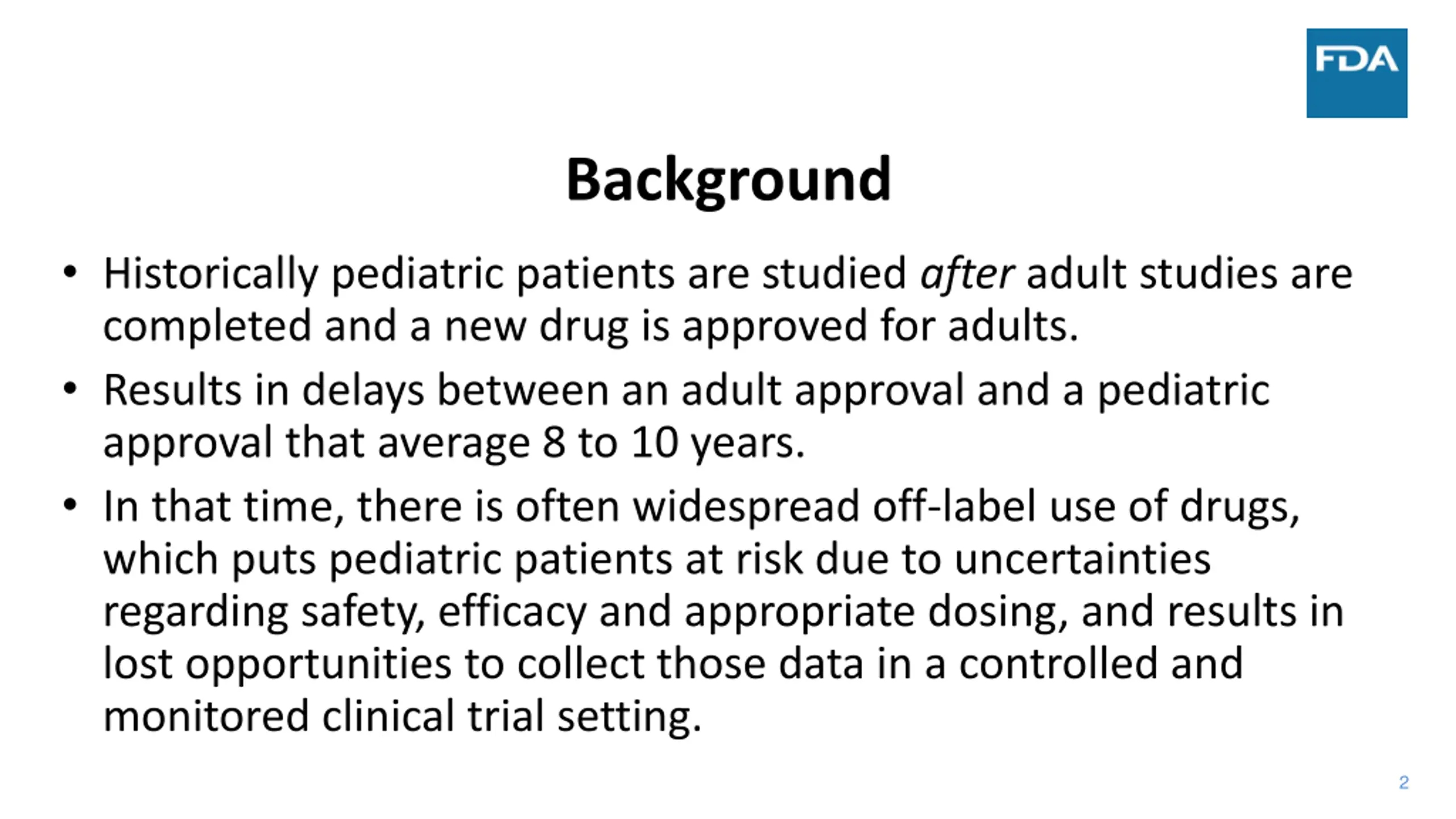 Background Historically pediatric patients are studied after adult studies are completed and a new drug is approved for adults. Results in delays between an adult approval and a pediatric approval that average 8 to 10 years. In that time, there is often widespread off-label use of drugs, which puts pediatric patients at risk due to uncertainties regarding safety, efficacy and appropriate dosing, and results in lost opportunities to collect those data in a controlled and monitored clinical trial setting. 2