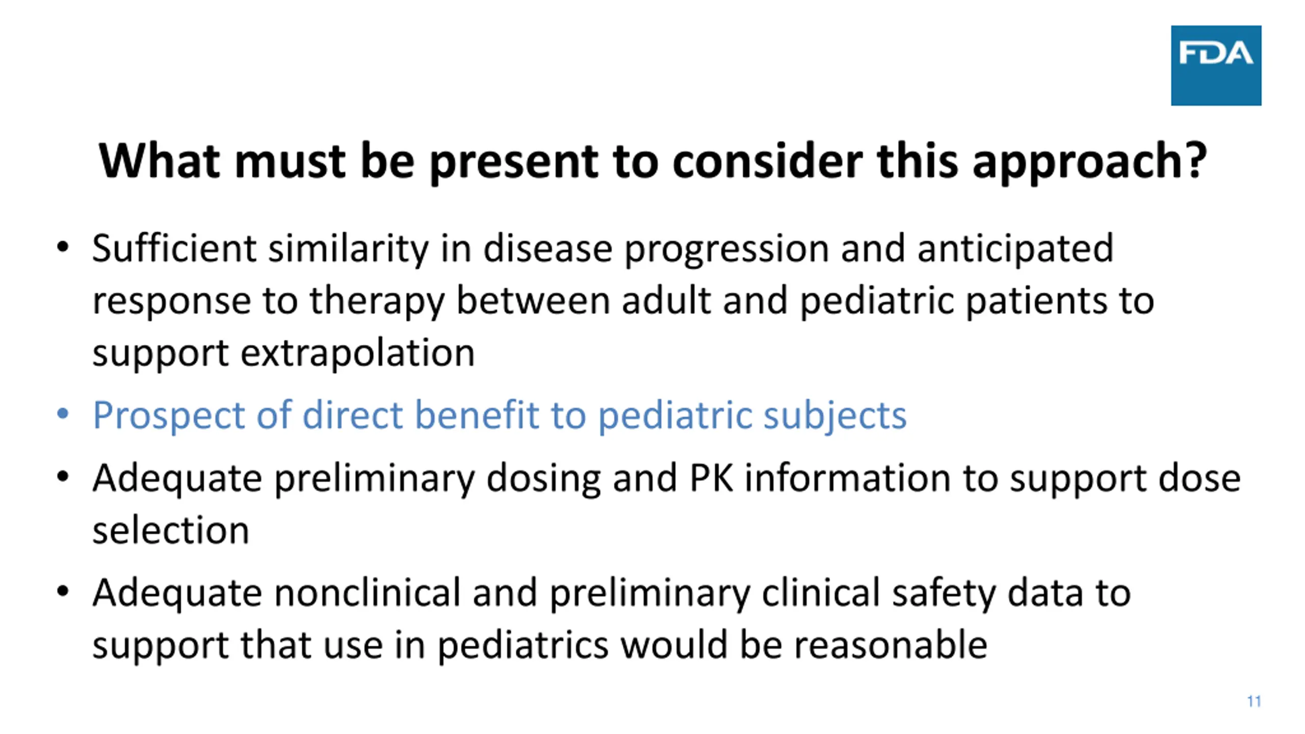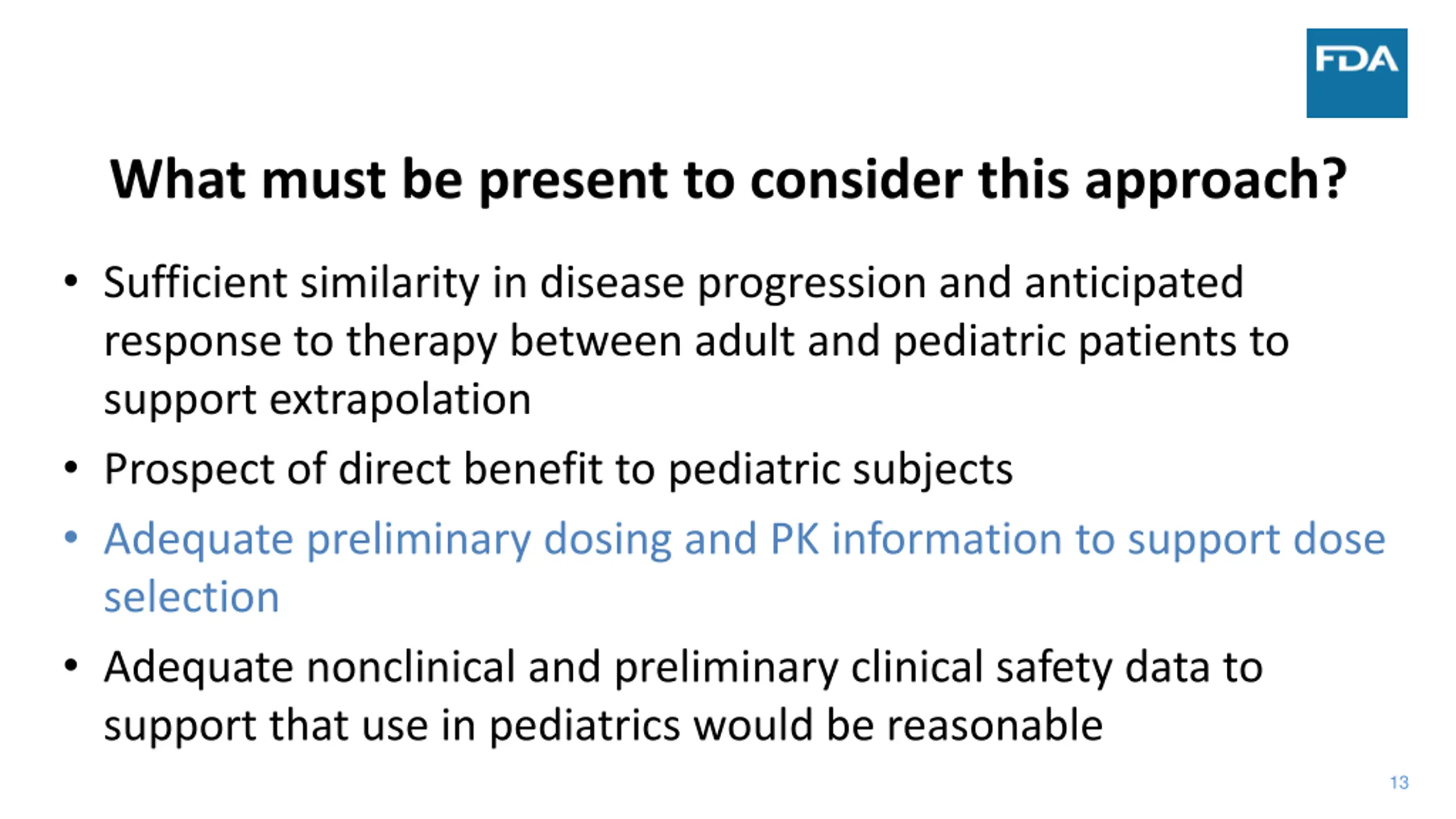 What must be present to consider this approach? Sufficient similarity in disease progression and anticipated response to therapy between adult and pediatric patients to support extrapolation Prospect of direct benefit to pediatric subjects Adequate preliminary dosing and PK information to support dose selection Adequate nonclinical and preliminary clinical safety data to support that use in pediatrics would be reasonable 11