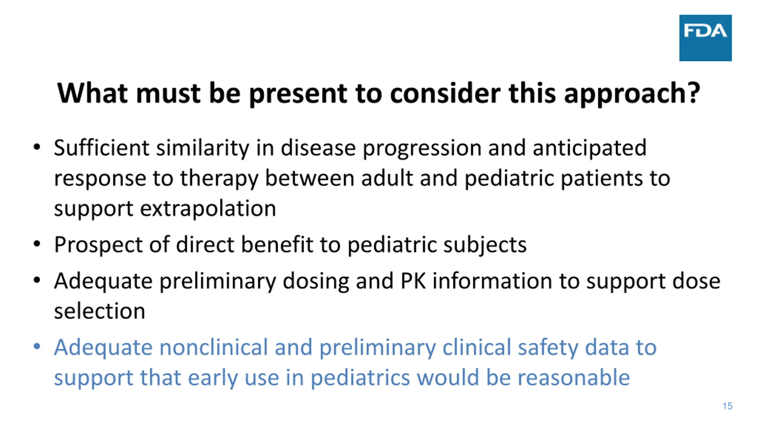 What must be present to consider this approach? Sufficient similarity in disease progression and anticipated response to therapy between adult and pediatric patients to support extrapolation Prospect of direct benefit to pediatric subjects Adequate preliminary dosing and PK information to support dose selection Adequate nonclinical and preliminary clinical safety data to support that early use in pediatrics would be reasonable 15