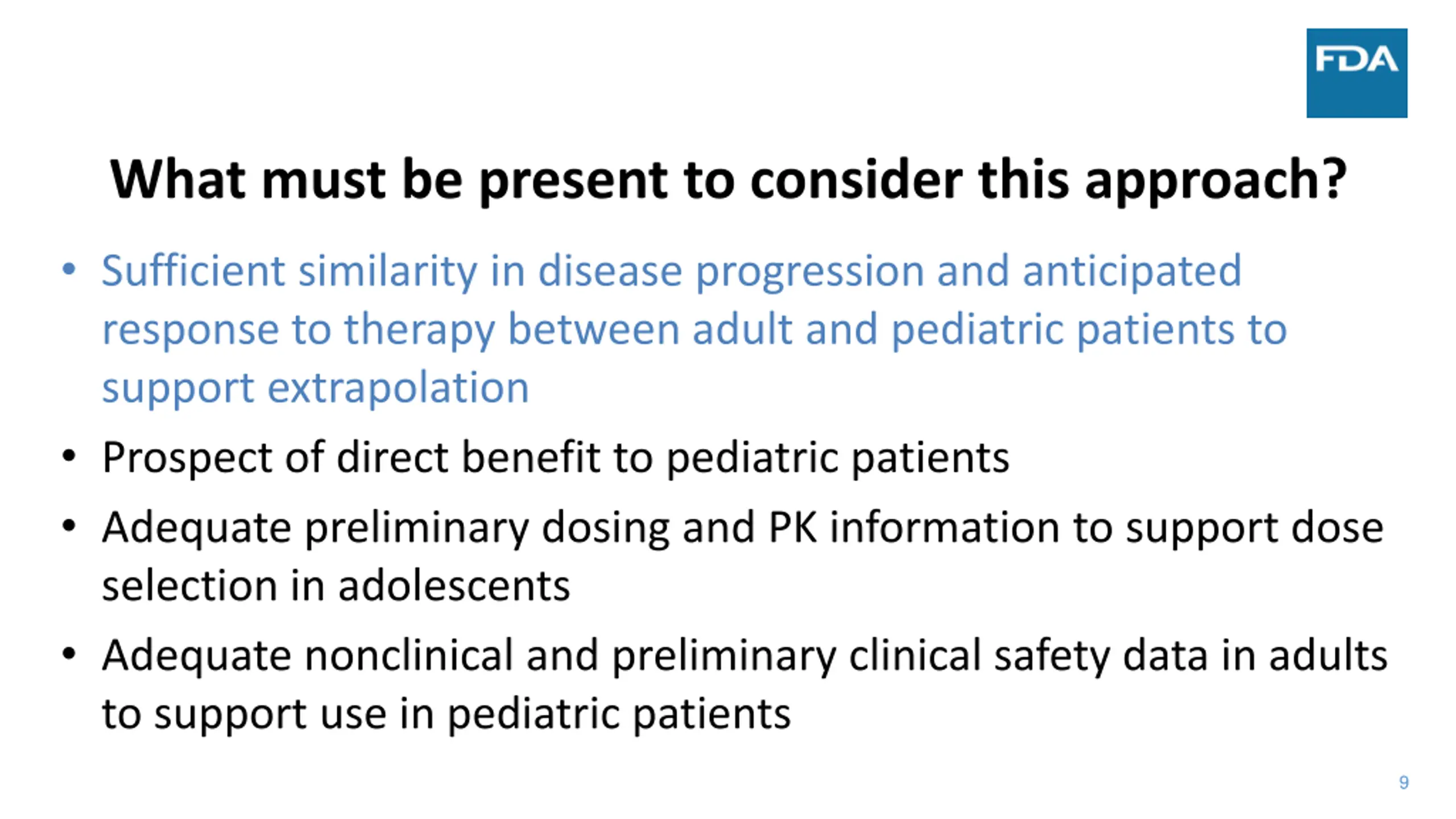 What must be present to consider this approach? Sufficient similarity in disease progression and anticipated response to therapy between adult and pediatric patients to support extrapolation Prospect of direct benefit to pediatric patients Adequate preliminary dosing and PK information to support dose selection in adolescents Adequate nonclinical and preliminary clinical safety data in adults to support use in pediatric patients 9