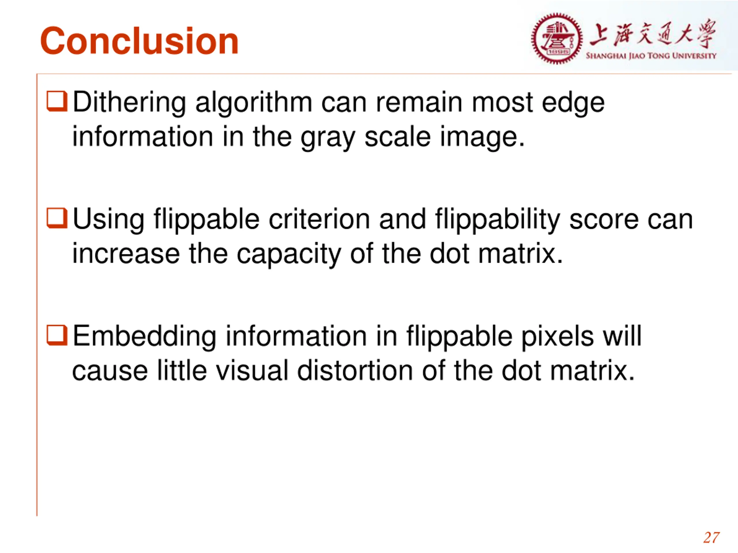 Conclusion Dithering algorithm can remain most edge information in the gray scale image. Using flippable criterion and flippability score can increase the capacity of the dot matrix. Embedding information in flippable pixels will cause little visual distortion of the dot matrix. 27