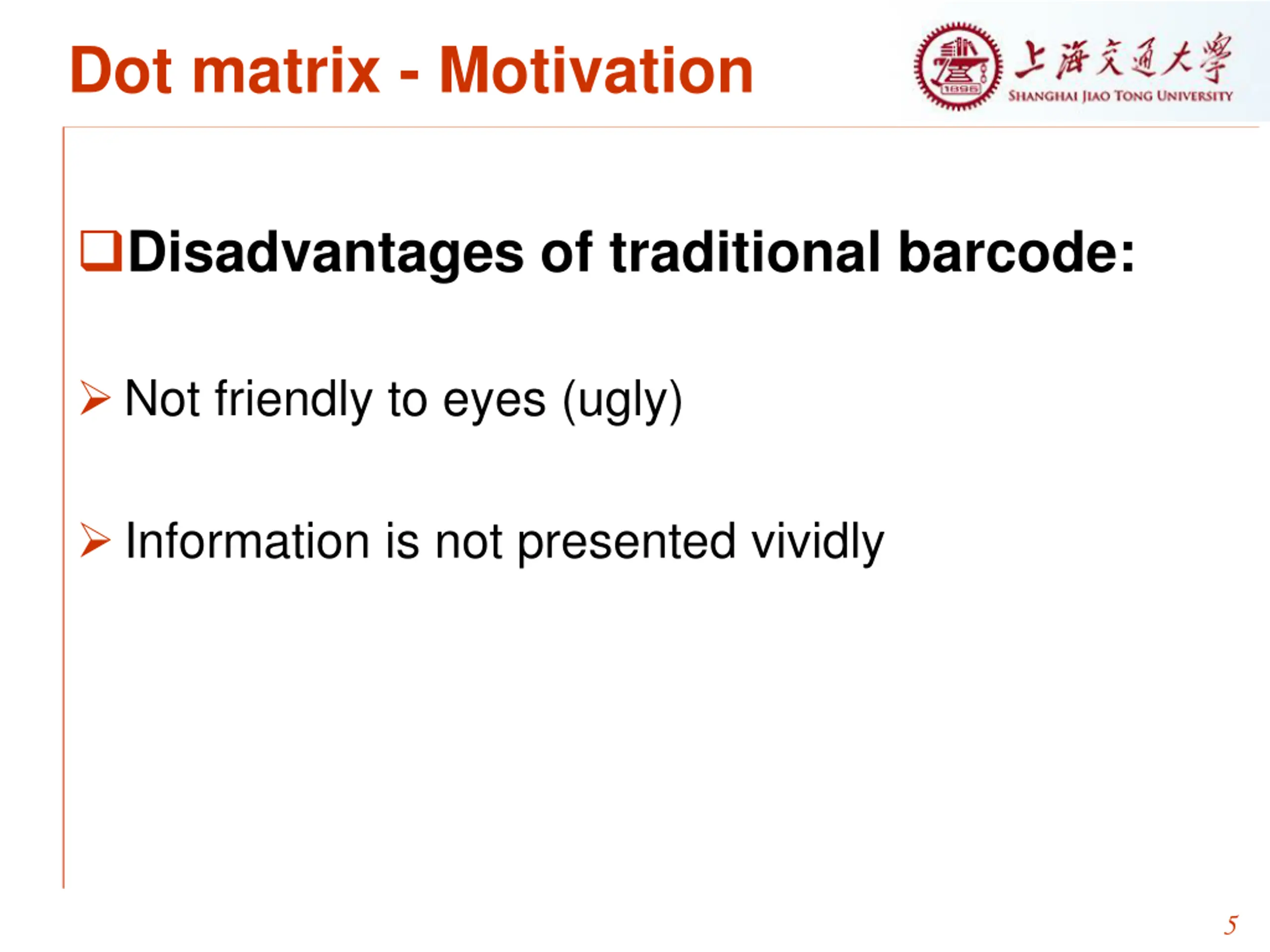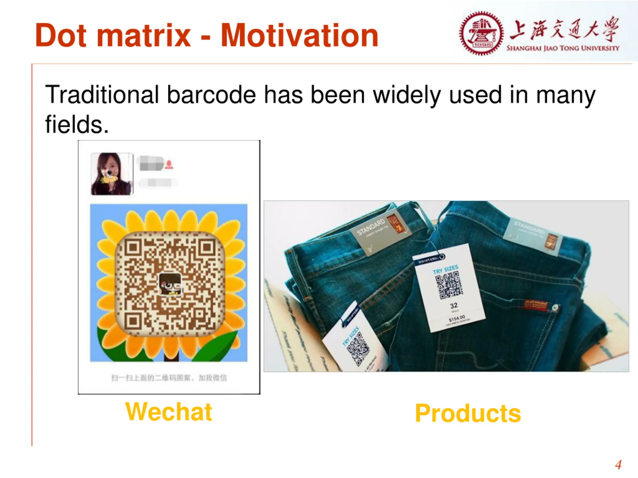 Dot matrix - Motivation Traditional barcode has been widely used in many fields. Wechat Products 4