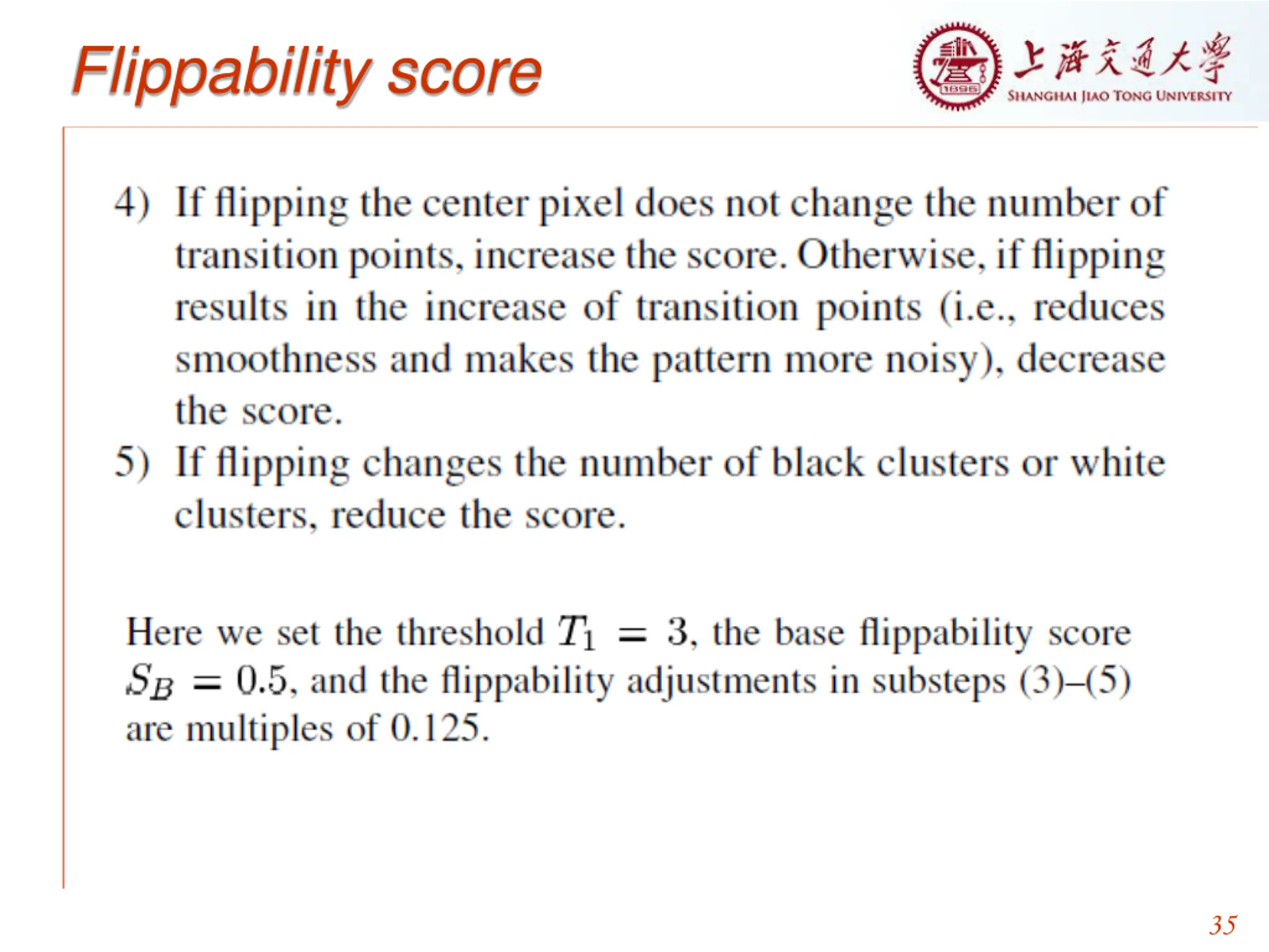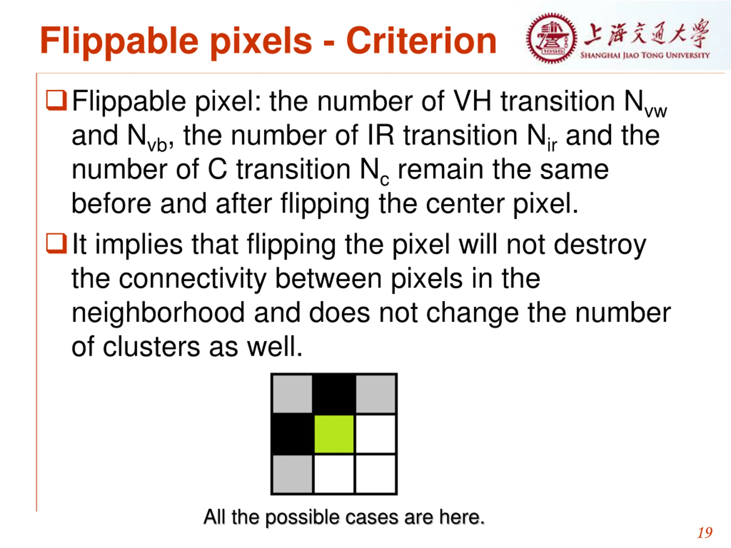 Flippable pixels - Criterion Flippable pixel: the number of VH transition Nvw and Nvb, the number of IR transition Nir and the number of C transition Nc remain the same before and after flipping the center pixel. It implies that flipping the pixel will not destroy the connectivity between pixels in the neighborhood and does not change the number of clusters as well. All the possible cases are here. 19