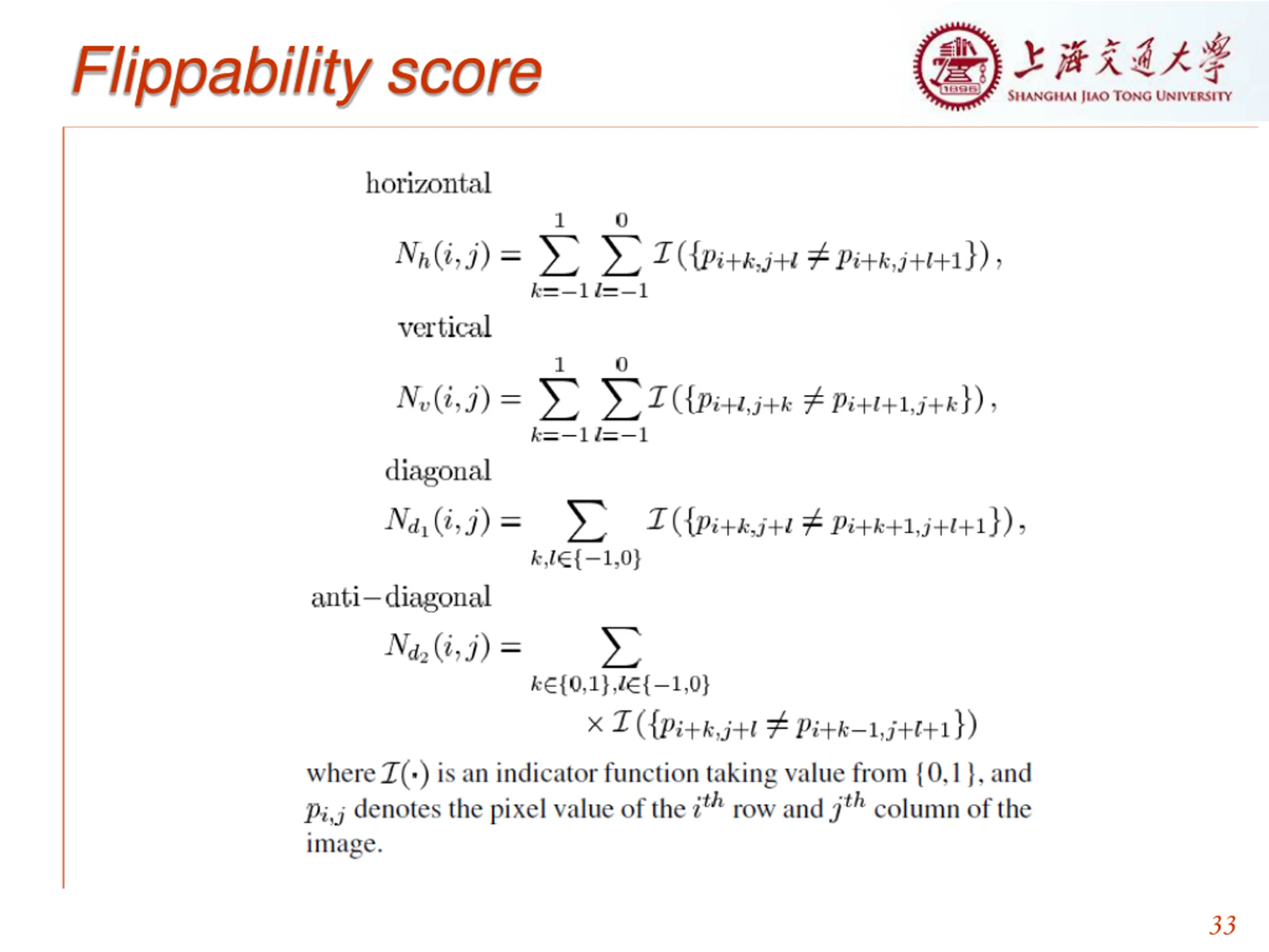 Flippable pixels - Criterion Let s use 1 and 0 to denote black and white pixels, respectively. The nine variables are shown below. Definition 1: The number of uniform white transition Nvw and the number of uniform black transition Nvb in a 3*3 block along vertical and horizontal directions are collectively defined as VH Transition and given by 17