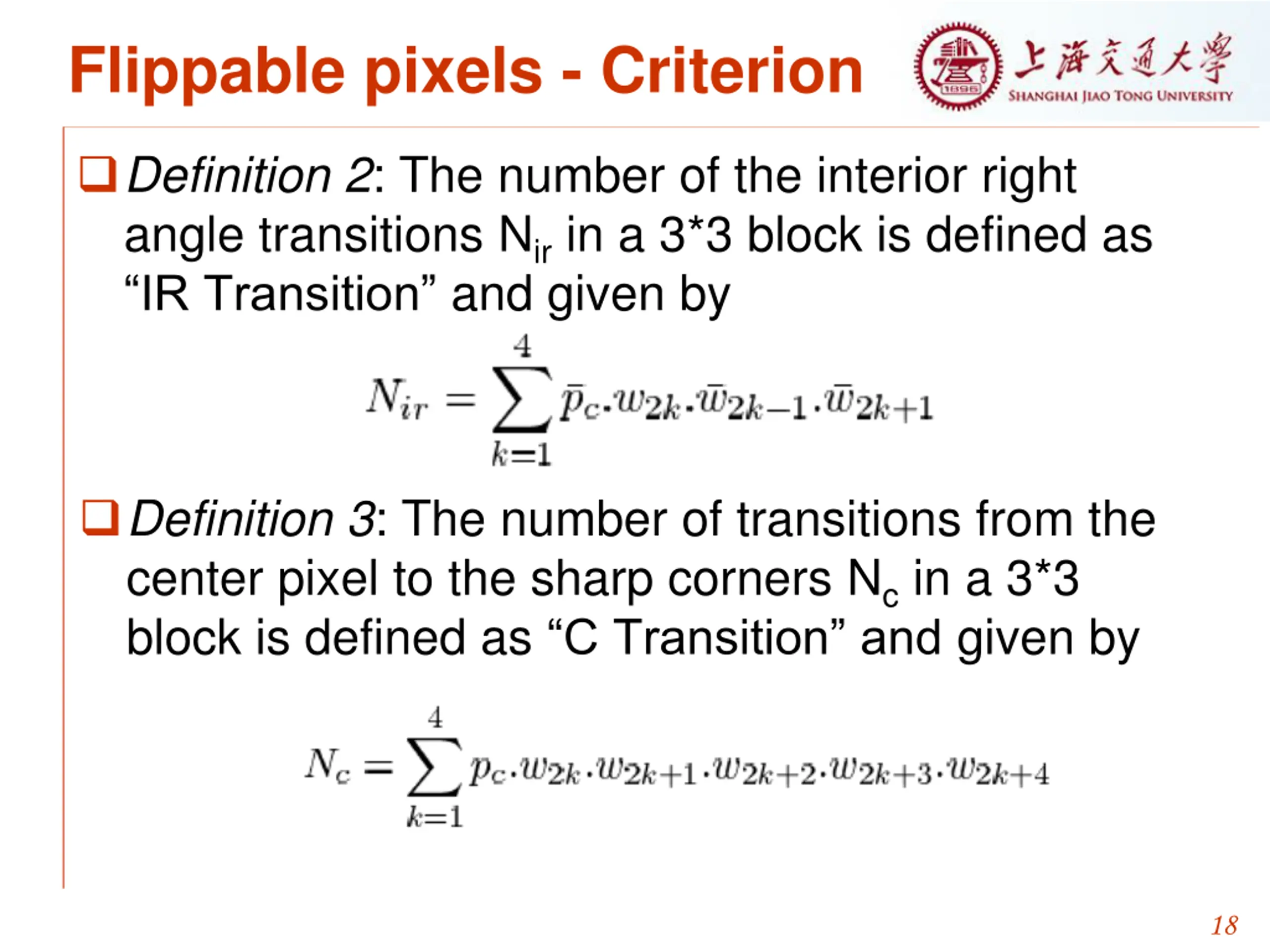 Flippable pixels - Criterion Definition 2: The number of the interior right angle transitions Nir in a 3*3 block is defined as IR Transition and given by Definition 3: The number of transitions from the center pixel to the sharp corners Nc in a 3*3 block is defined as C Transition and given by 18