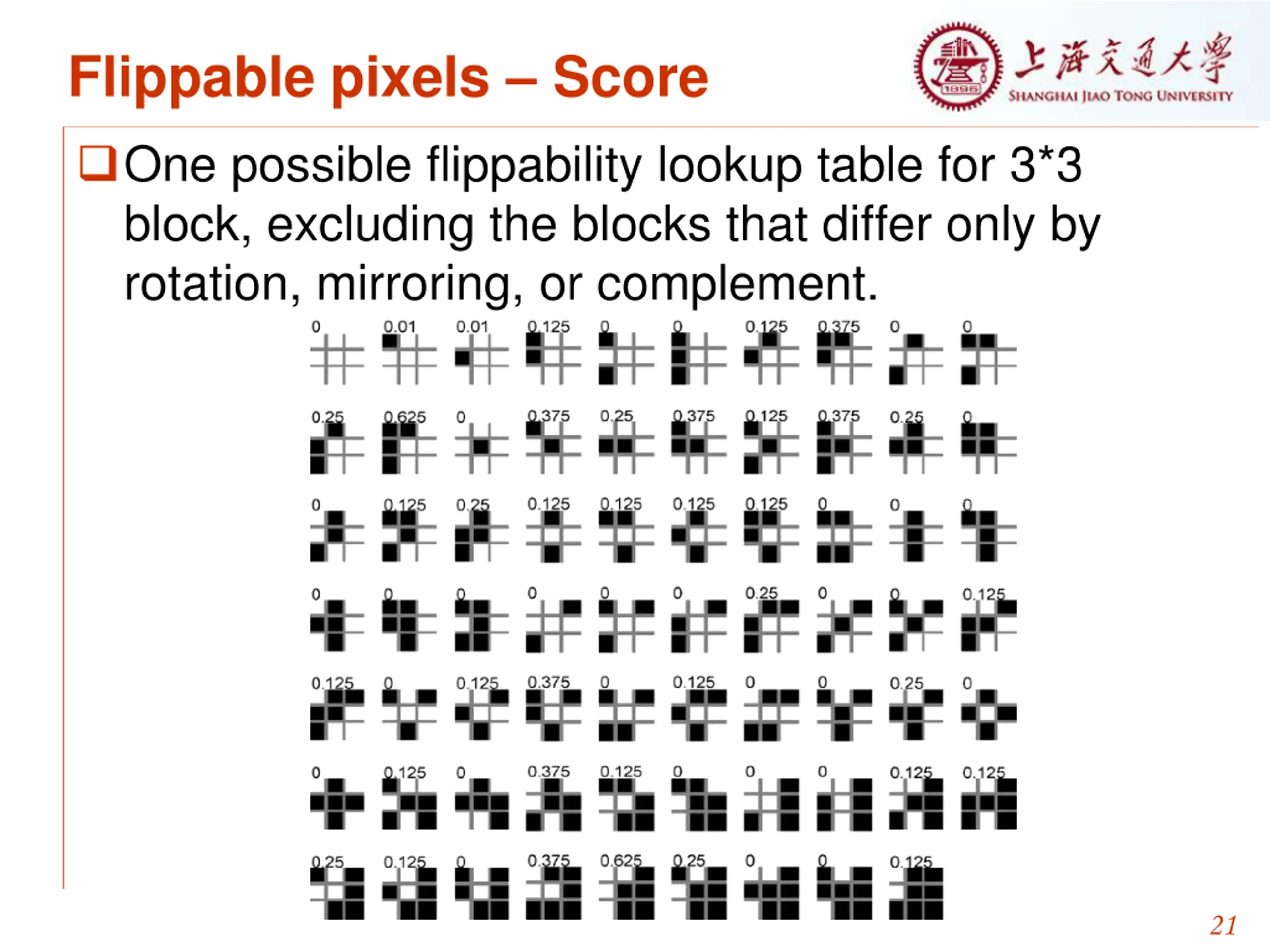 Flippable pixels Score One possible flippability lookup table for 3*3 block, excluding the blocks that differ only by rotation, mirroring, or complement. 21