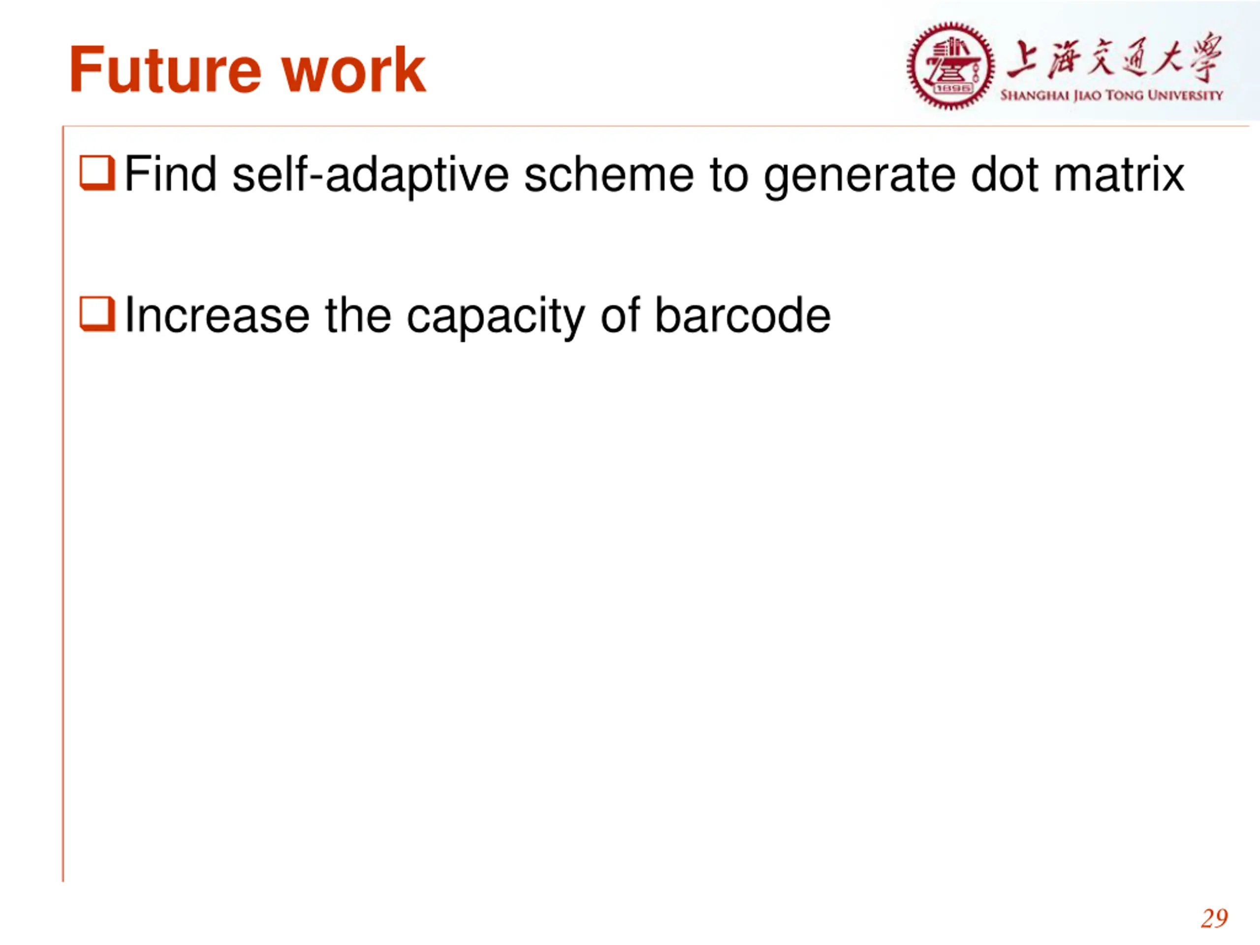 Future work Find self-adaptive scheme to generate dot matrix Increase the capacity of barcode 29